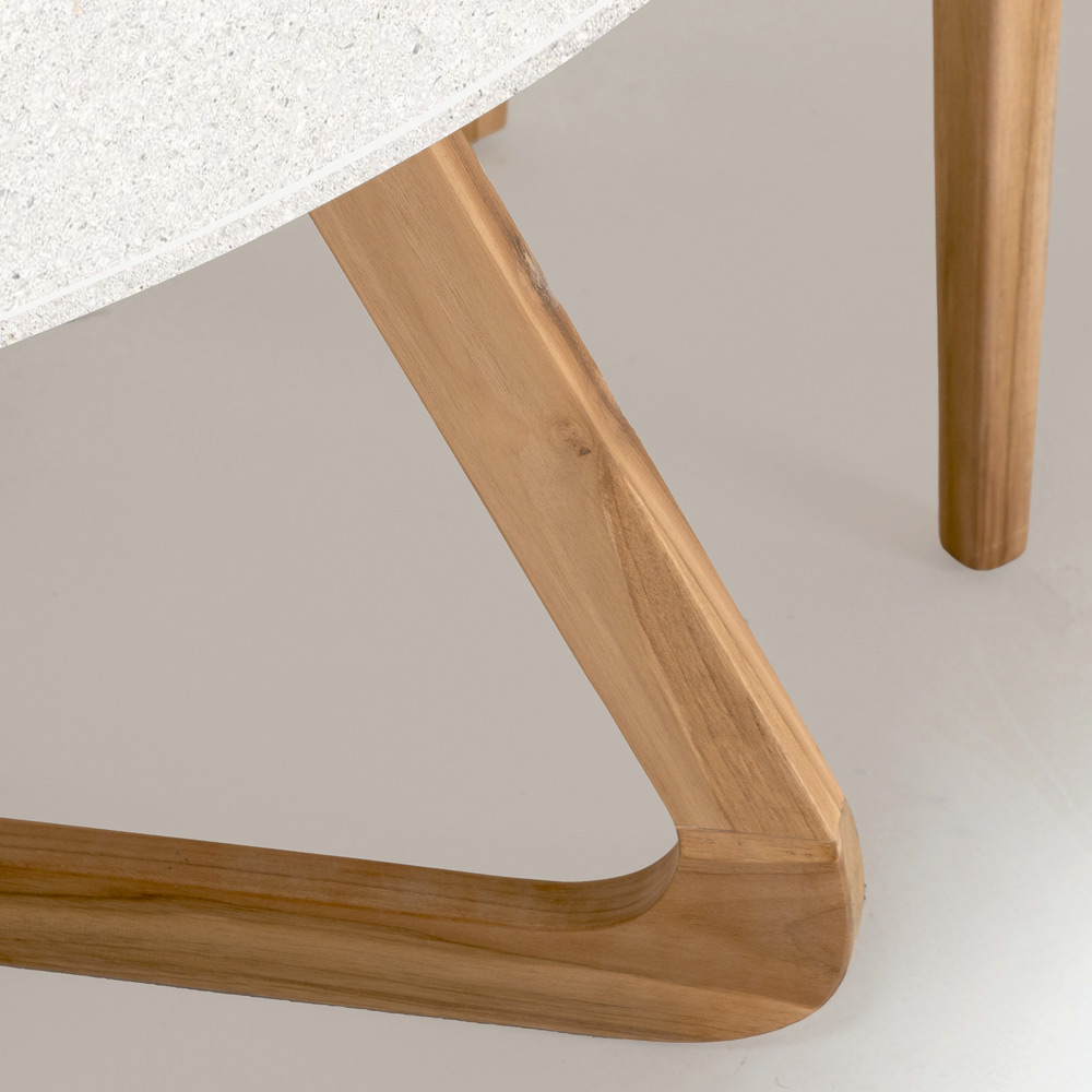 Drewniana podstawa harmonijnie komponuje się z nowoczesnym ceramicznym blatem, oferując połączenie naturalnego ciepła i nowoczesnego designu. Ta kompozycja jest nie tylko estetyczna, ale także gwarantuje stabilność i trwałość dzięki wysokiej jakości materiałom dobranym do warunków zewnętrznych.