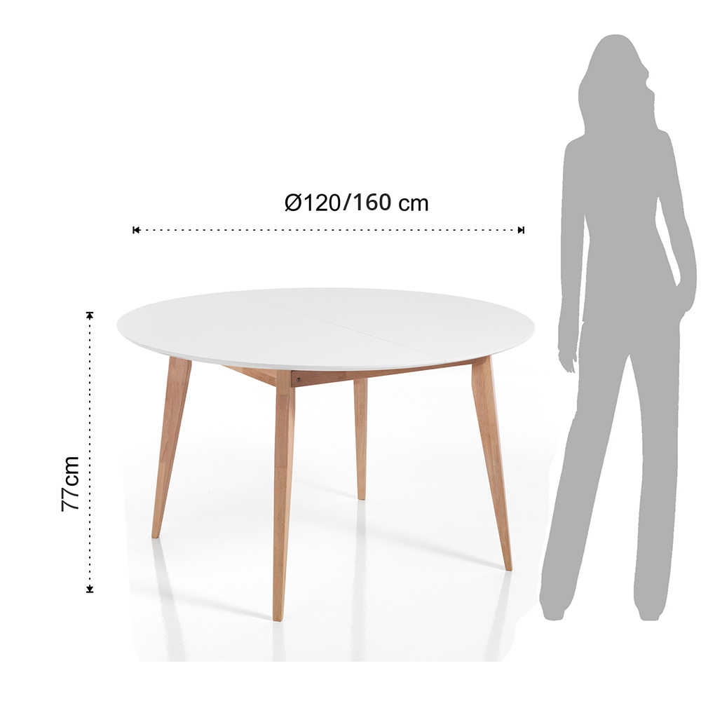 Stół do jadalni z okrągłym rozkładanym blatem wykonanym z matowego białego lakierowanego mdf (grubość 3 cm) i nogami z litego drewna z wykończeniem z bielonego dębu . Produkt o prostym i czystym designie, idealny dla tych, którzy kochają podstawowy i wszechstronny styl mebli, które mogą dopełnić styl jadalni lub kuchni ze smakiem i osobowością. Jego mocną stroną jest wysuwany blat, który dzięki wysunięciu o 40 cm każdy osiąga długość 160 cm.