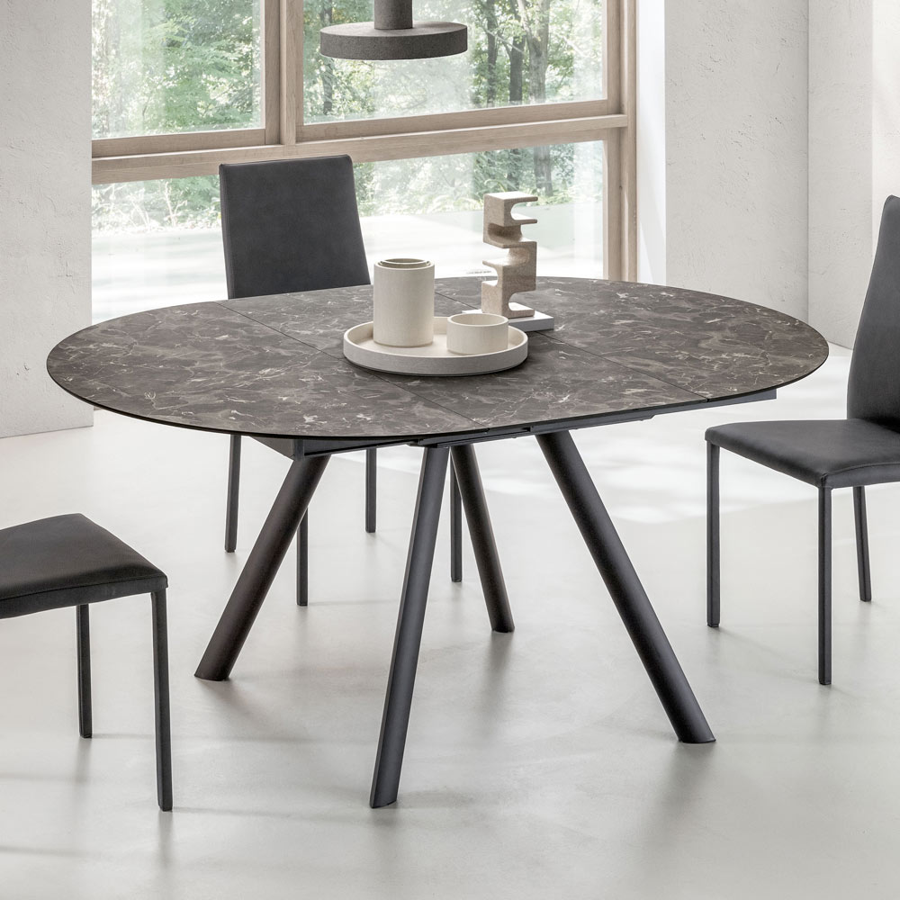Blat HPL dodaje jasności i wyrafinowania otoczeniu, przypominając żyły kamienia o odpornej powierzchni. Dzięki centralnemu systemowi rozkładania stół rozkłada się łatwo, oferując dodatkową przestrzeń dla gości lub rodzinnych obiadów, zachowując harmonijną linię nawet po rozłożeniu.