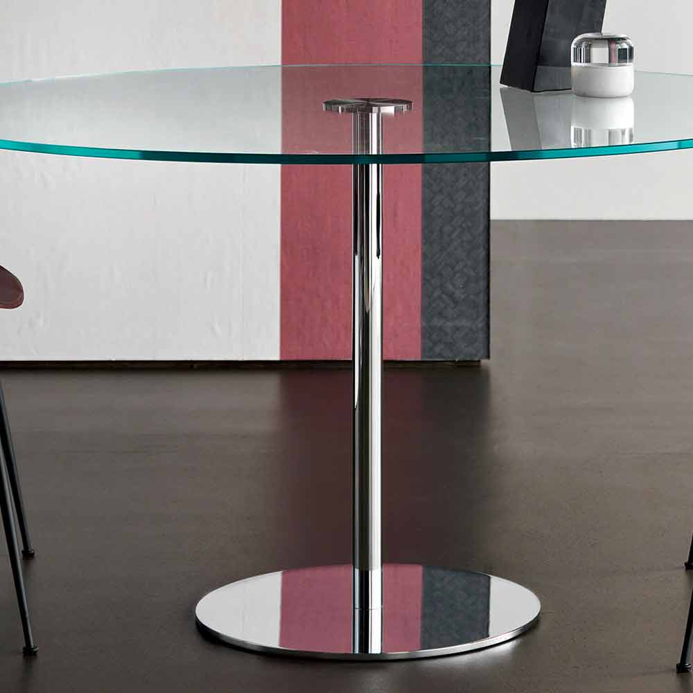 Okrągły luksusowy stół z wyjątkowo przezroczystym szklanym blatem i chromowaną metalową podstawą, wyprodukowany we Włoszech.
