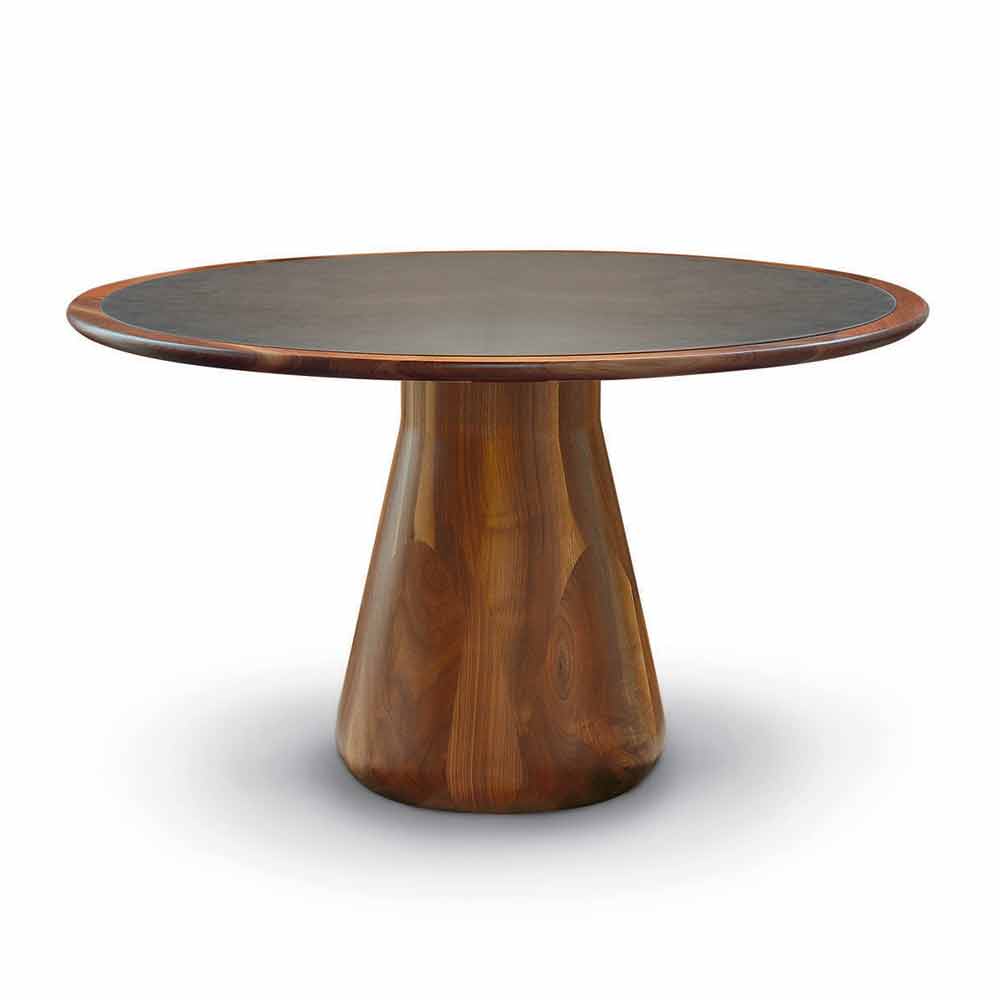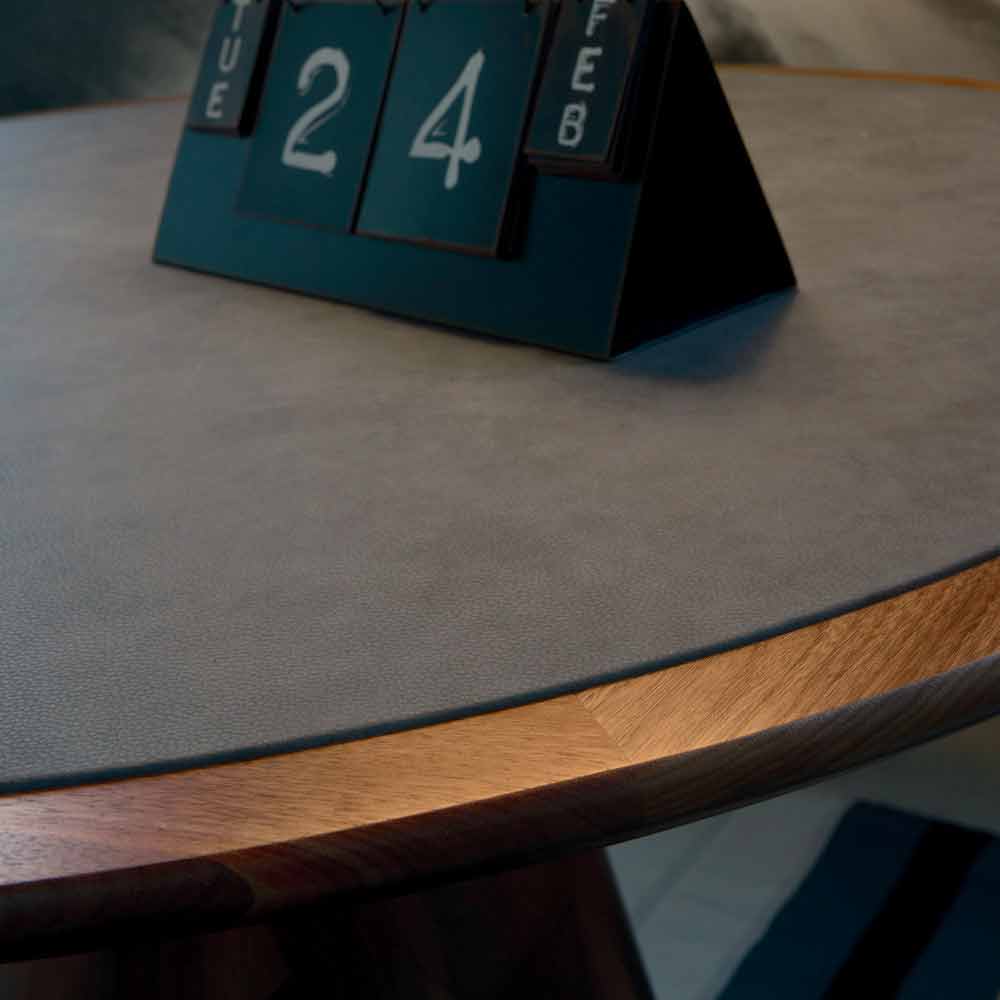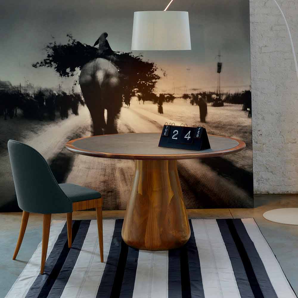 Naprawiono okrągły stół z blatem z litego orzecha. Podstawa z litego toczonego orzecha Canaletto. Carlo ma czyste cechy i linie, które zwiększają jego wartość. Wykonany z naturalnego orzecha i wykończony olejem, wykazuje szczególne wyrafinowanie stylistyczne dzięki kształtowi podstawy i blatu pokrytego ekoskórą.