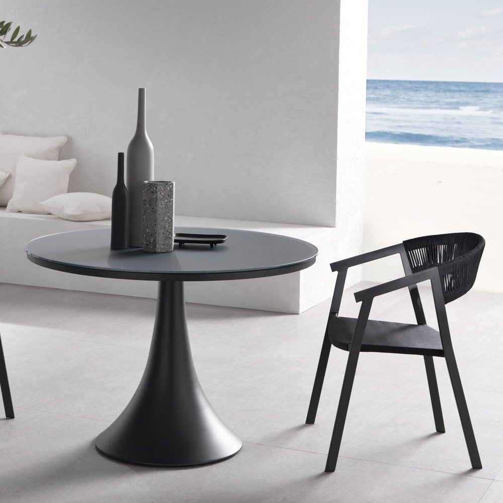 Okrągły stół ogrodowy z aluminiową konstrukcją pokrytą proszkiem epoksydowym i szklanym blatem malowanym z tyłu