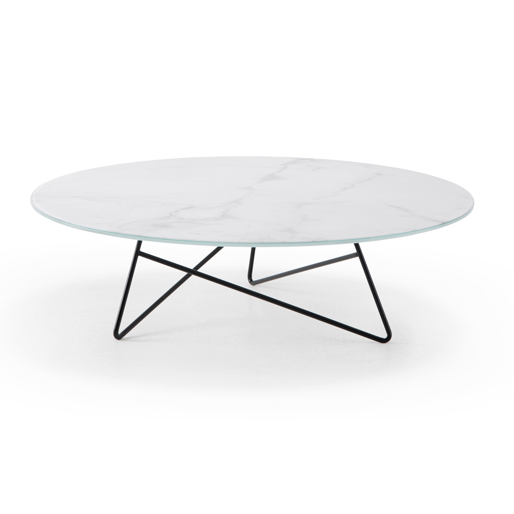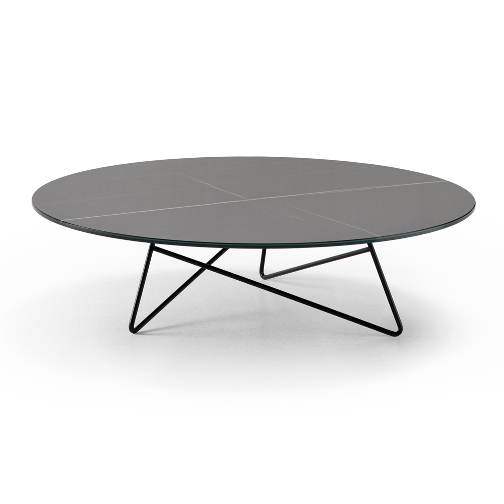 Niski stolik kawowy z okrągłym blatem ze szkła i marmuru, luksusowy przedmiot wyprodukowany we Włoszech.