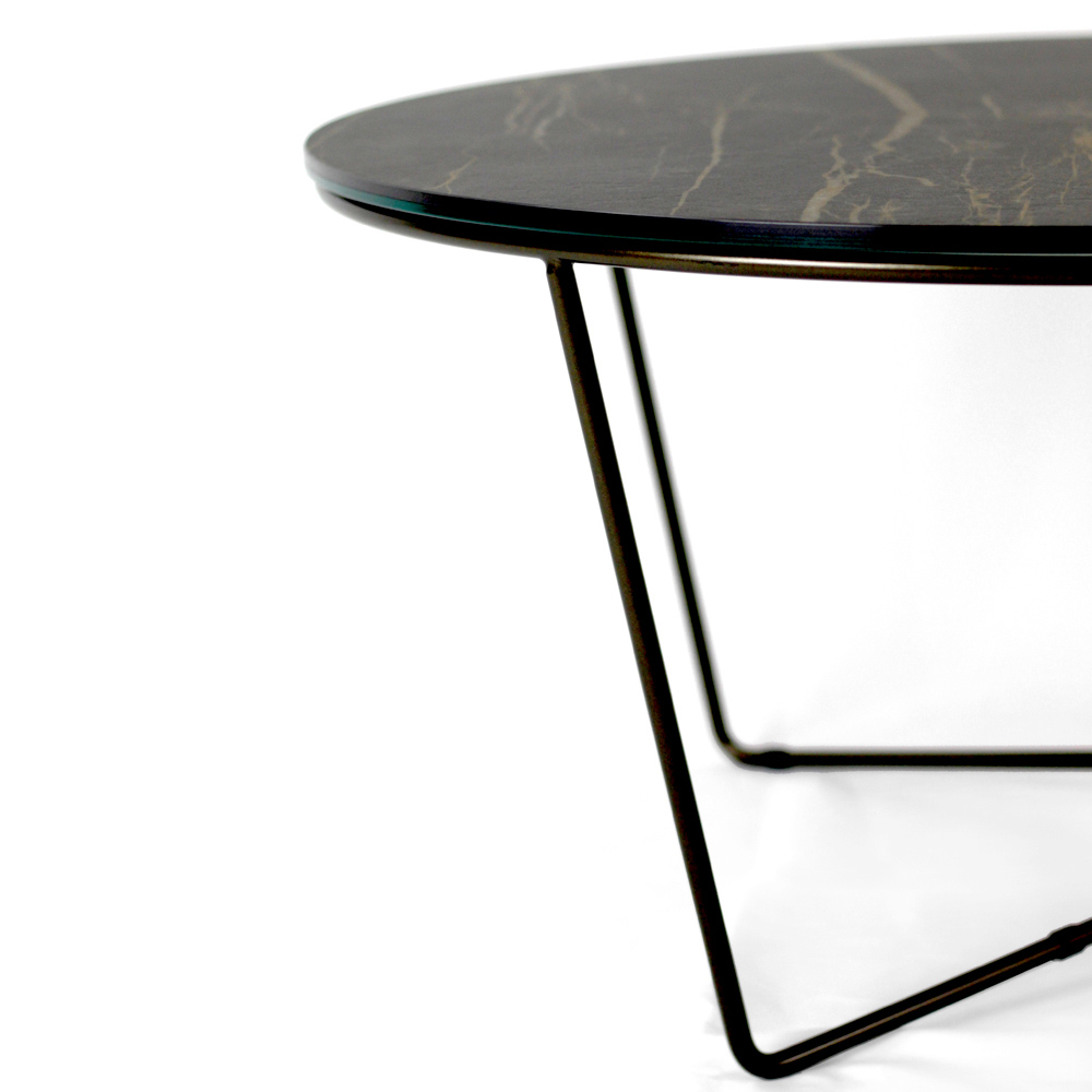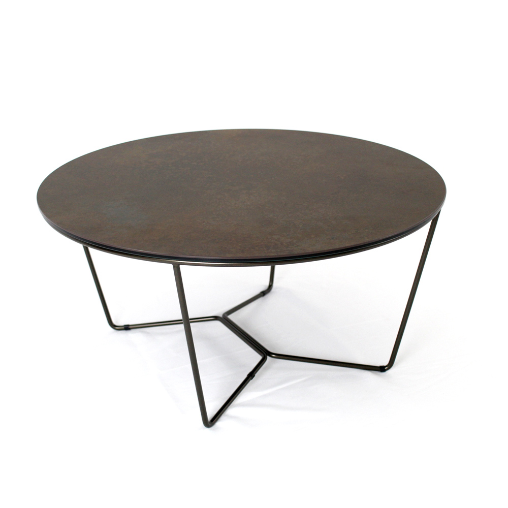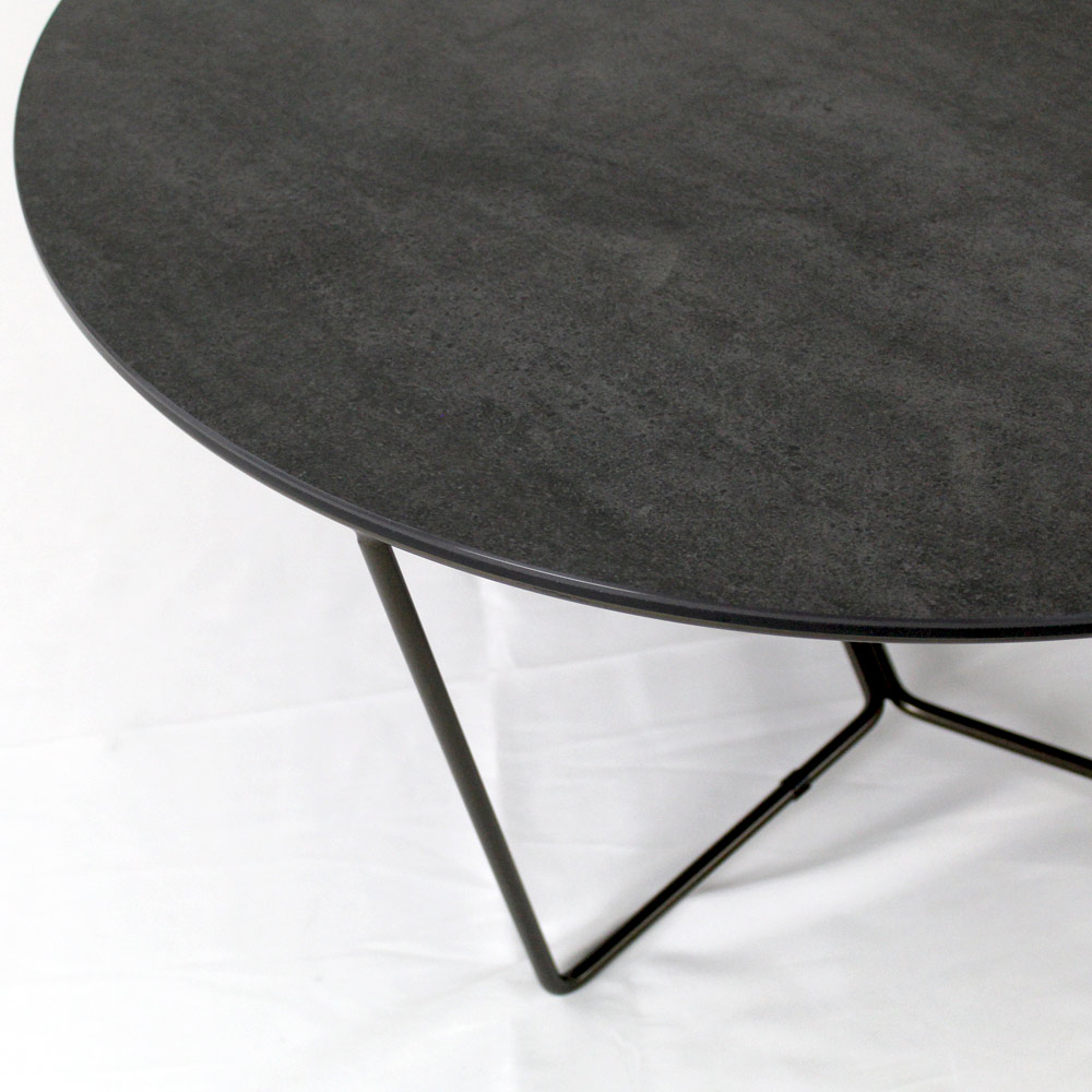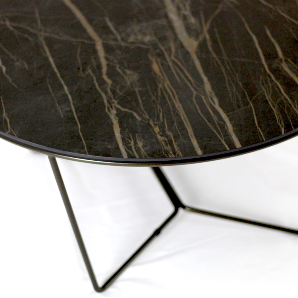 Okrągły stolik kawowy z malowaną stalową podstawą i blat z kamionki porcelanowej.