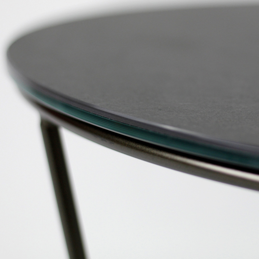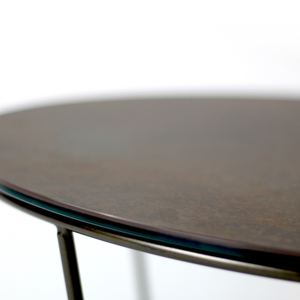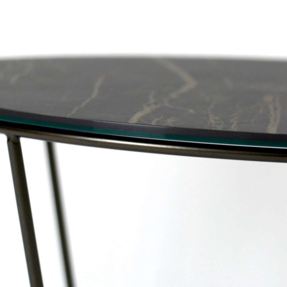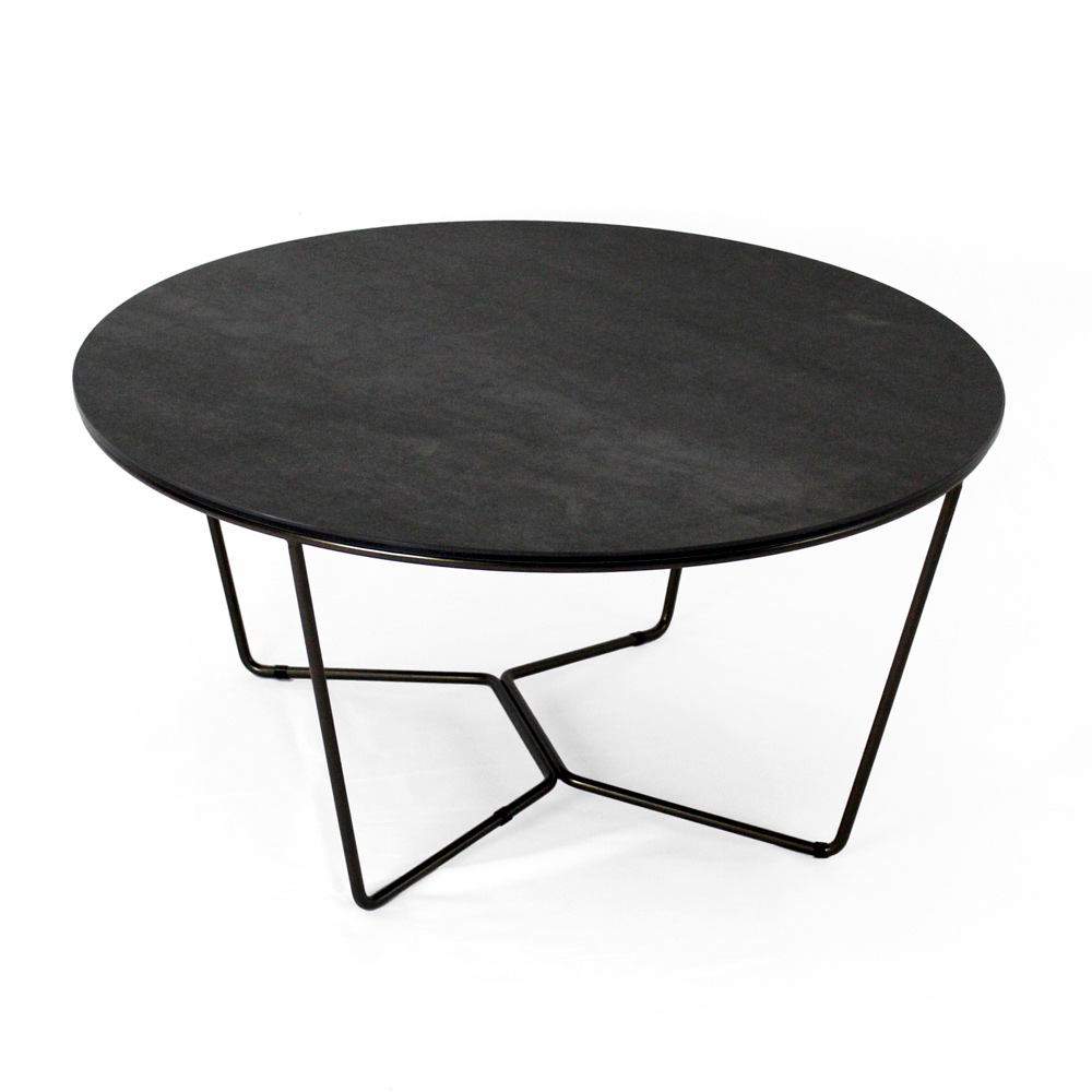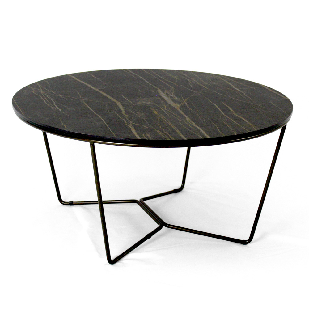 Okrągły stolik kawowy z malowaną stalową podstawą i blat z kamionki porcelanowej.