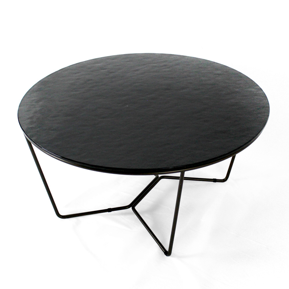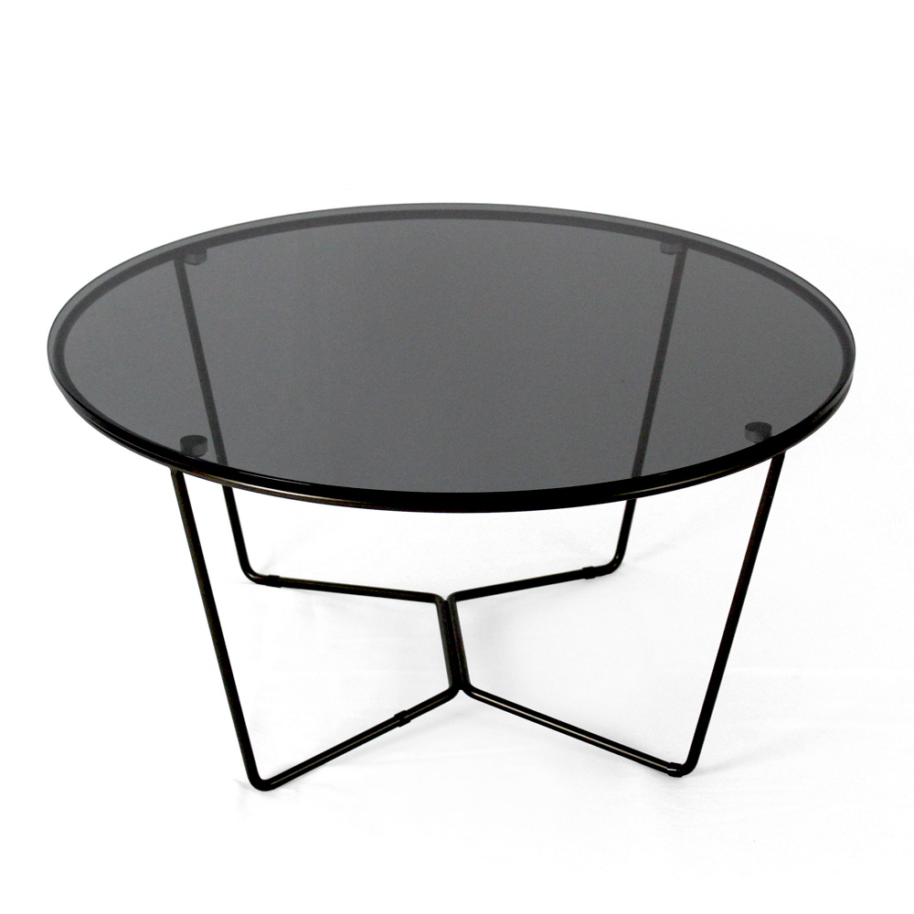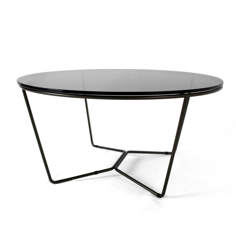 Okrągły stolik kawowy z malowaną stalową podstawą i szklany blat.