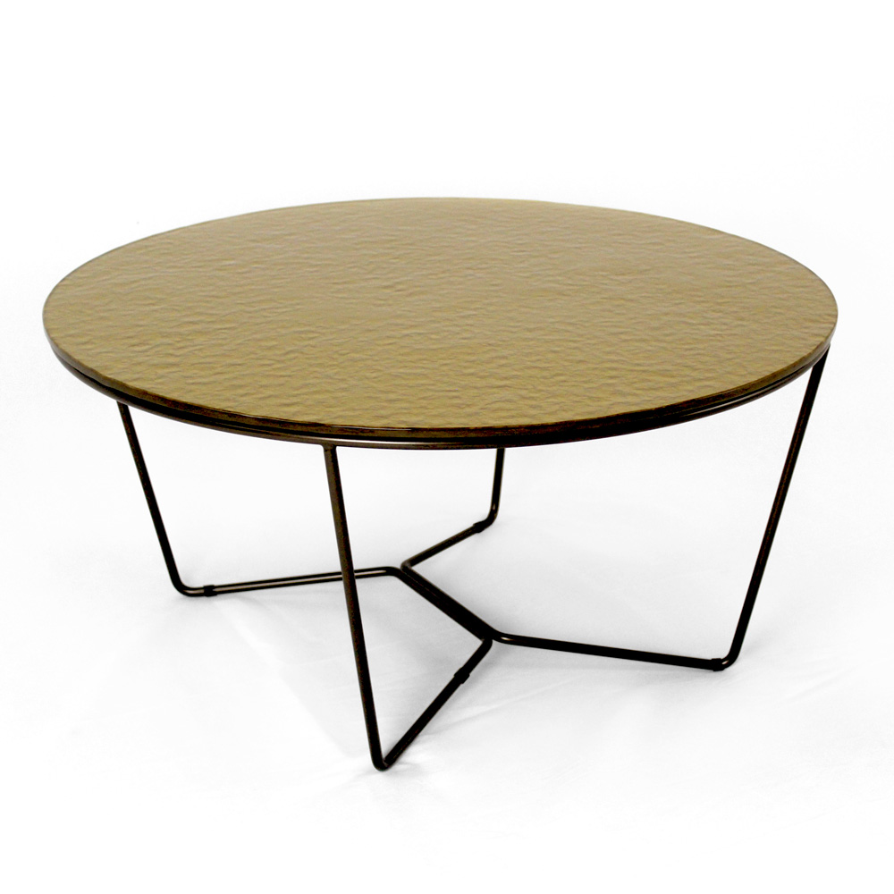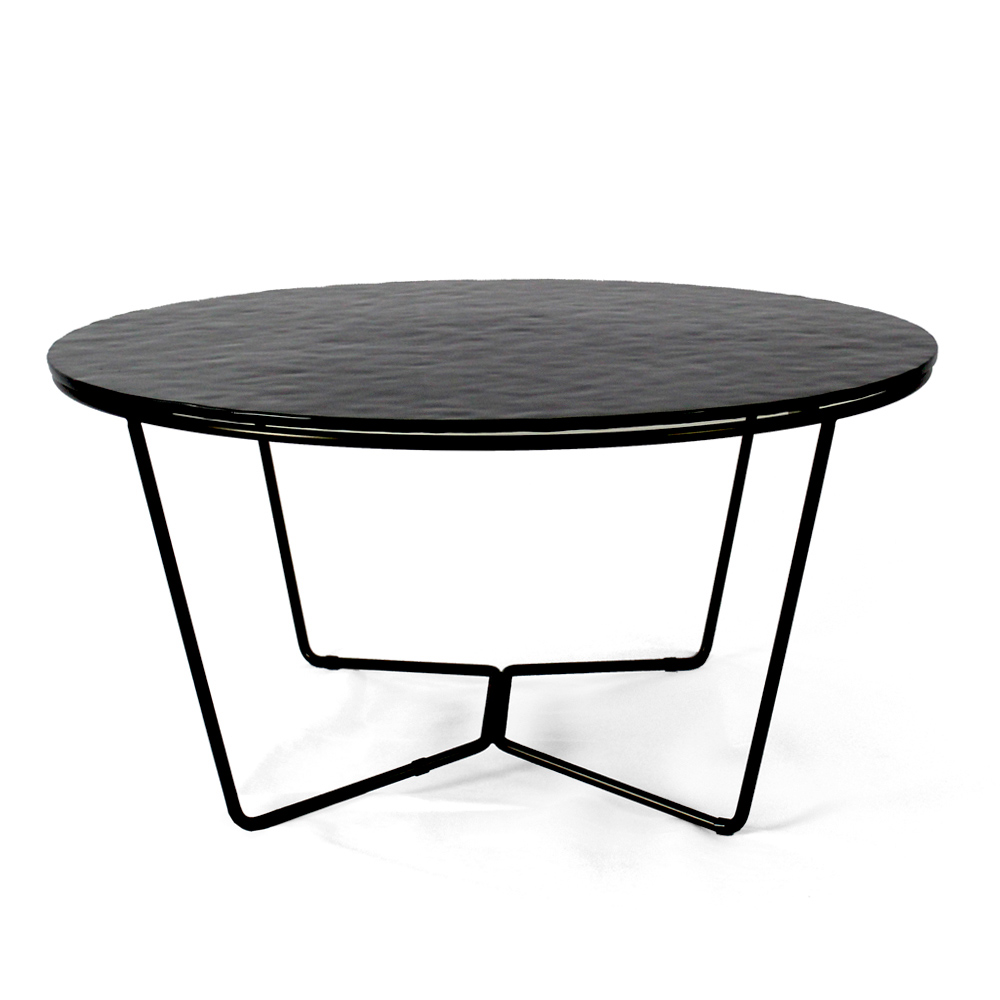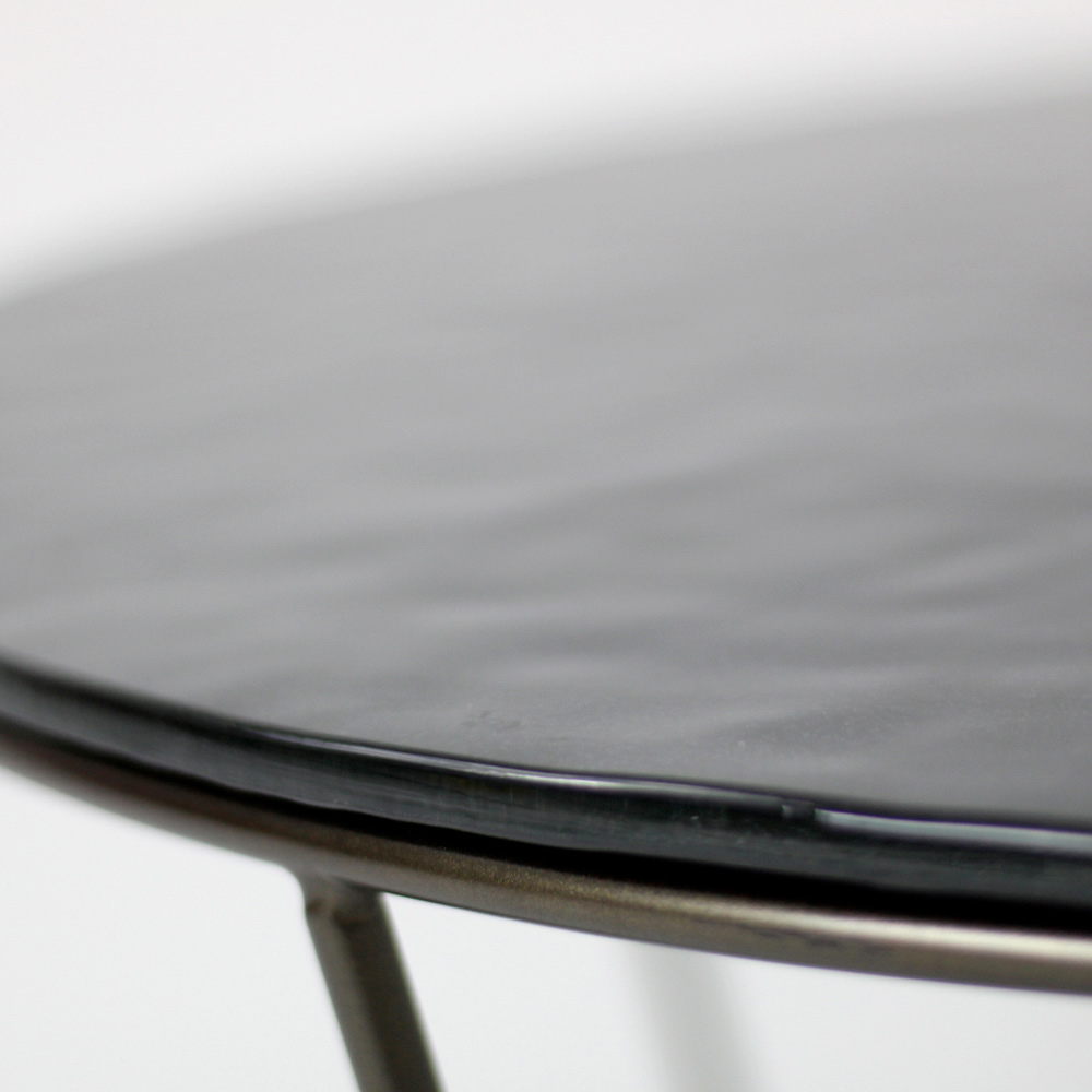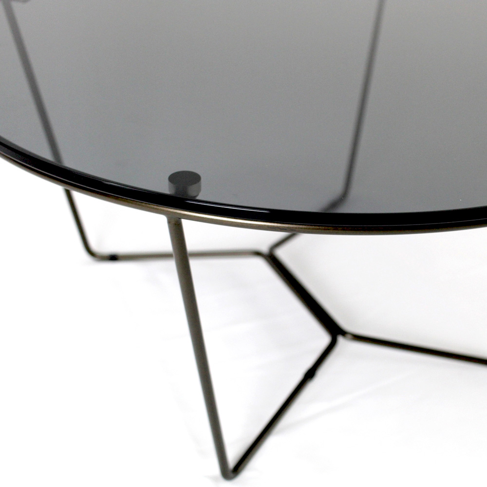 Okrągły stolik kawowy z malowaną stalową podstawą i szklany blat.