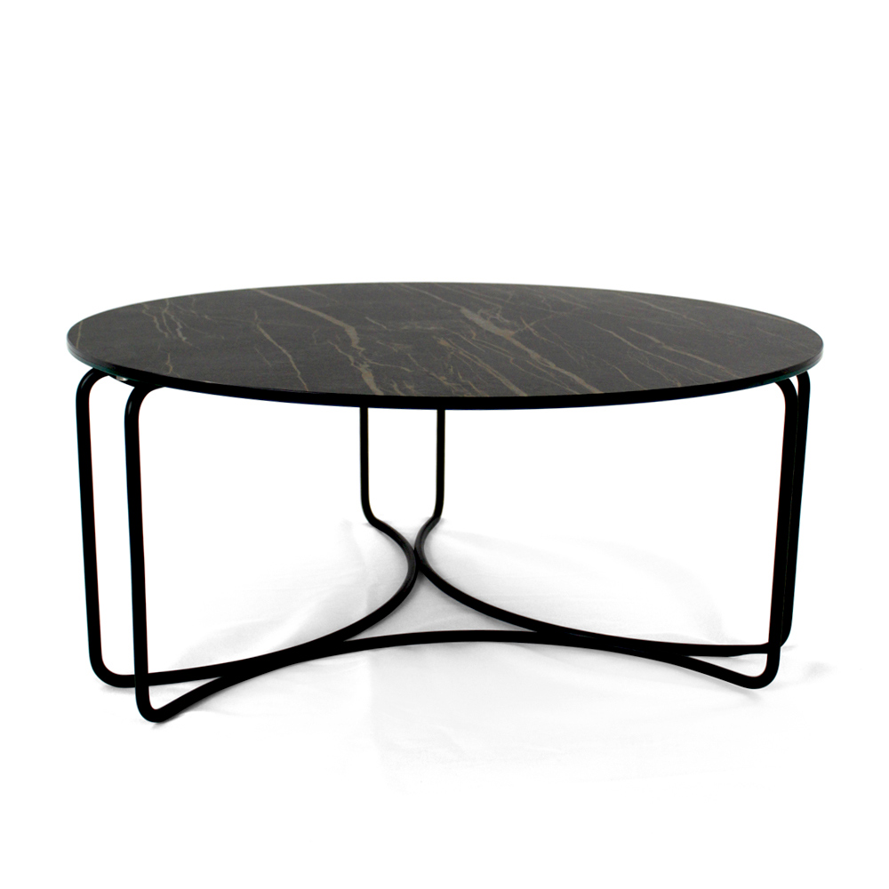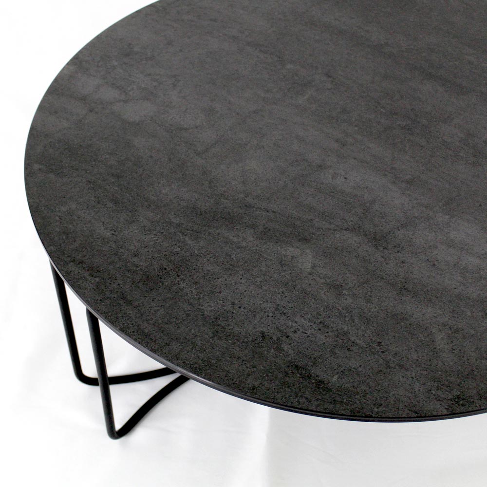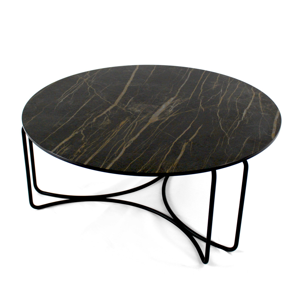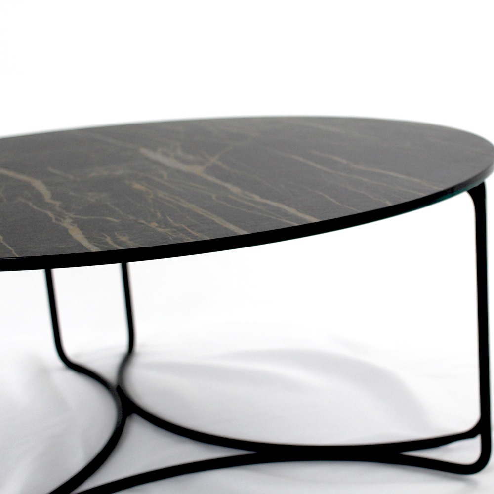 Okrągły stolik kawowy z malowaną stalową podstawą i blat z kamionki porcelanowej.