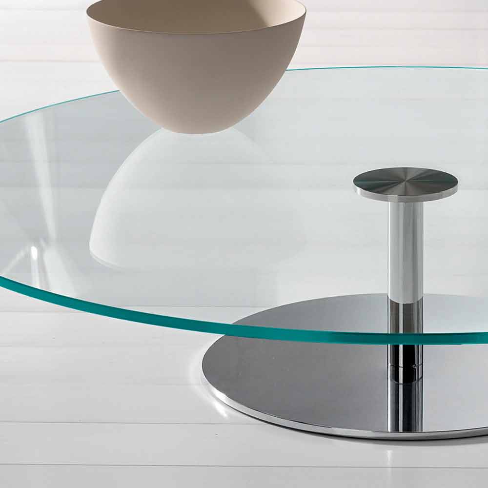 Ten niski stolik kawowy do salonu o okrągłym designie charakteryzuje się blatem wykonanym w całości z bardzo przezroczystego szkła oraz metalową podstawą w chromowanym wykończeniu, która tworzy wspaniałe efekty świetlne i trójwymiarowe.