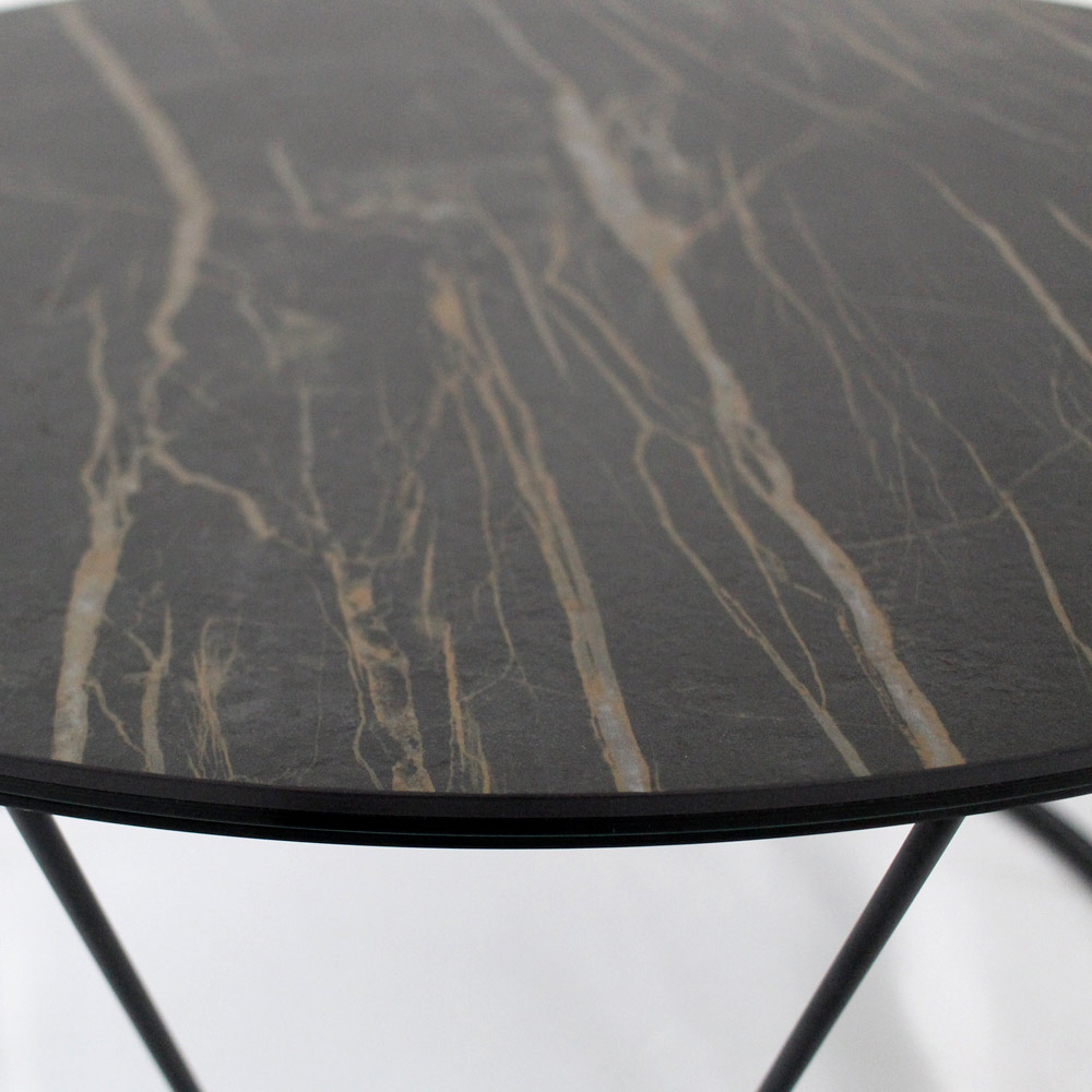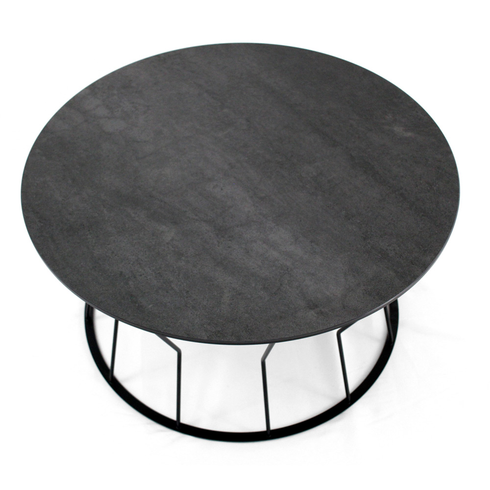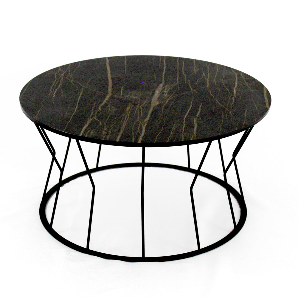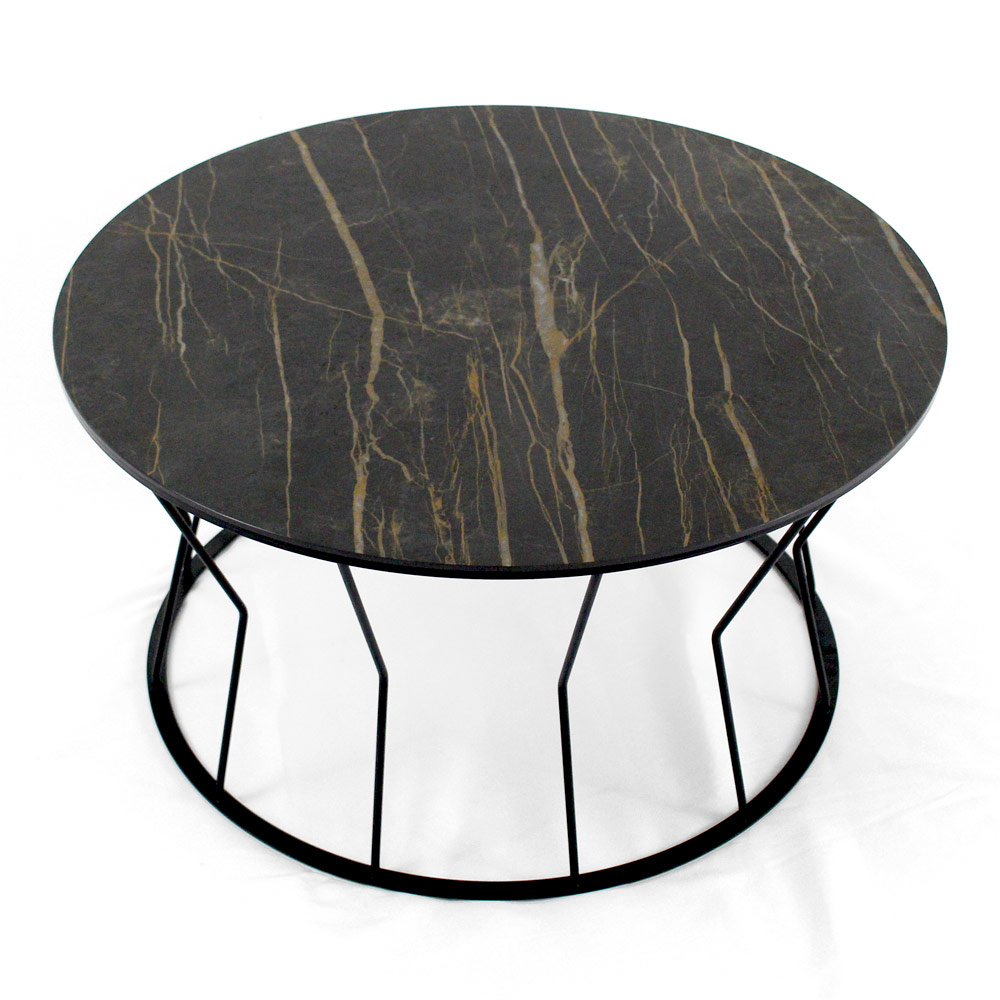 Okrągły stolik kawowy z malowaną stalową podstawą i blat z kamionki porcelanowej.