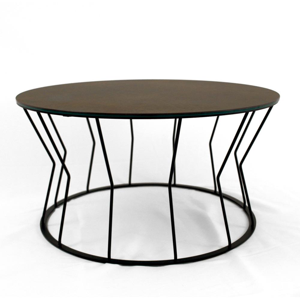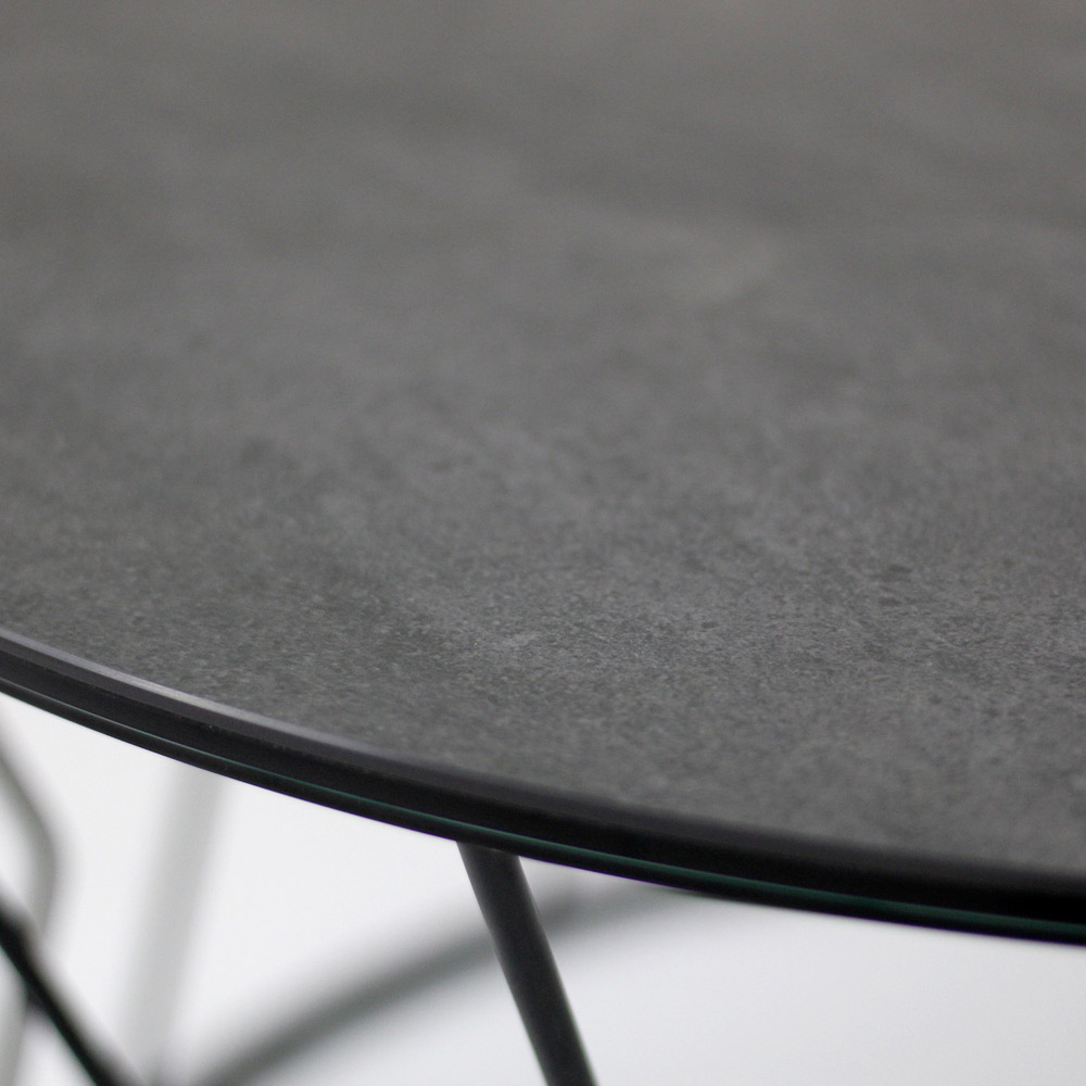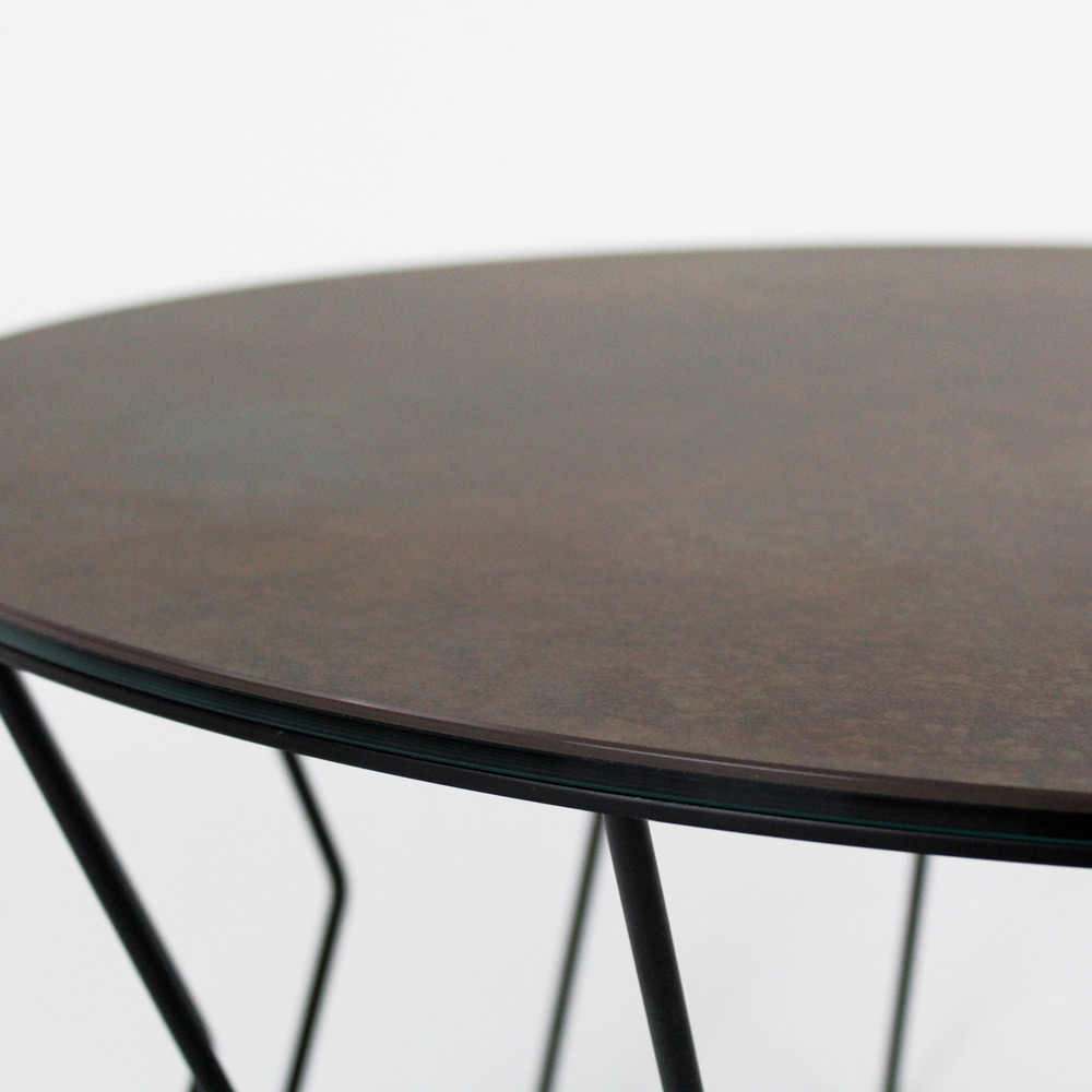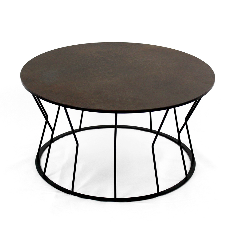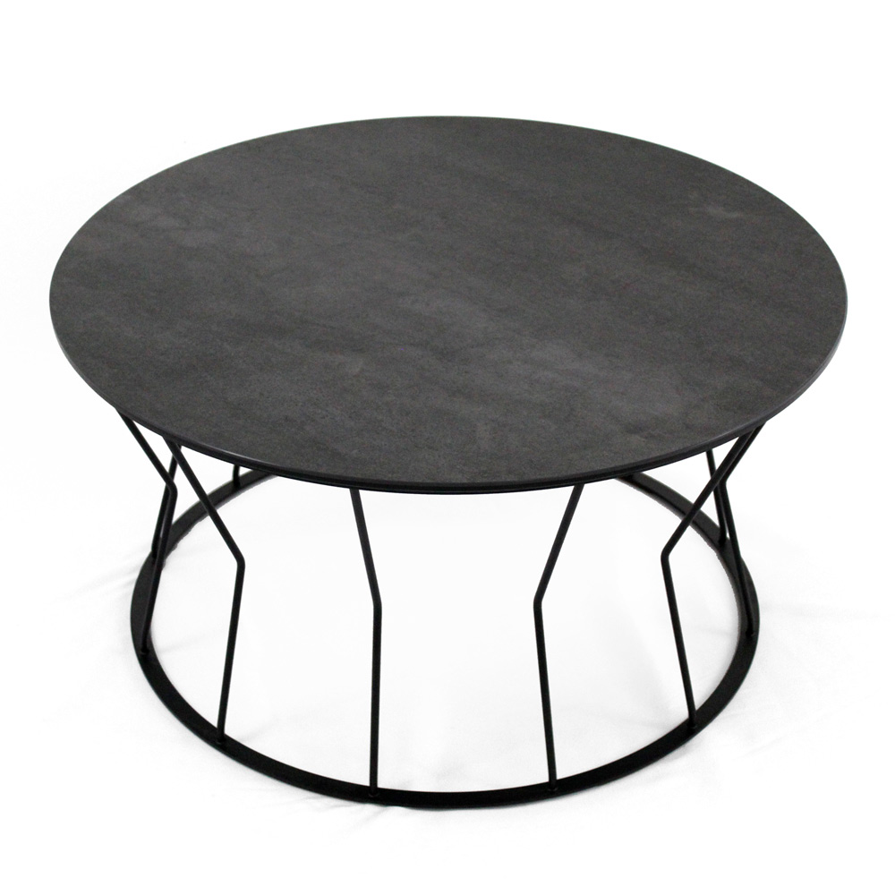 Okrągły stolik kawowy z malowaną stalową podstawą i blat z kamionki porcelanowej.