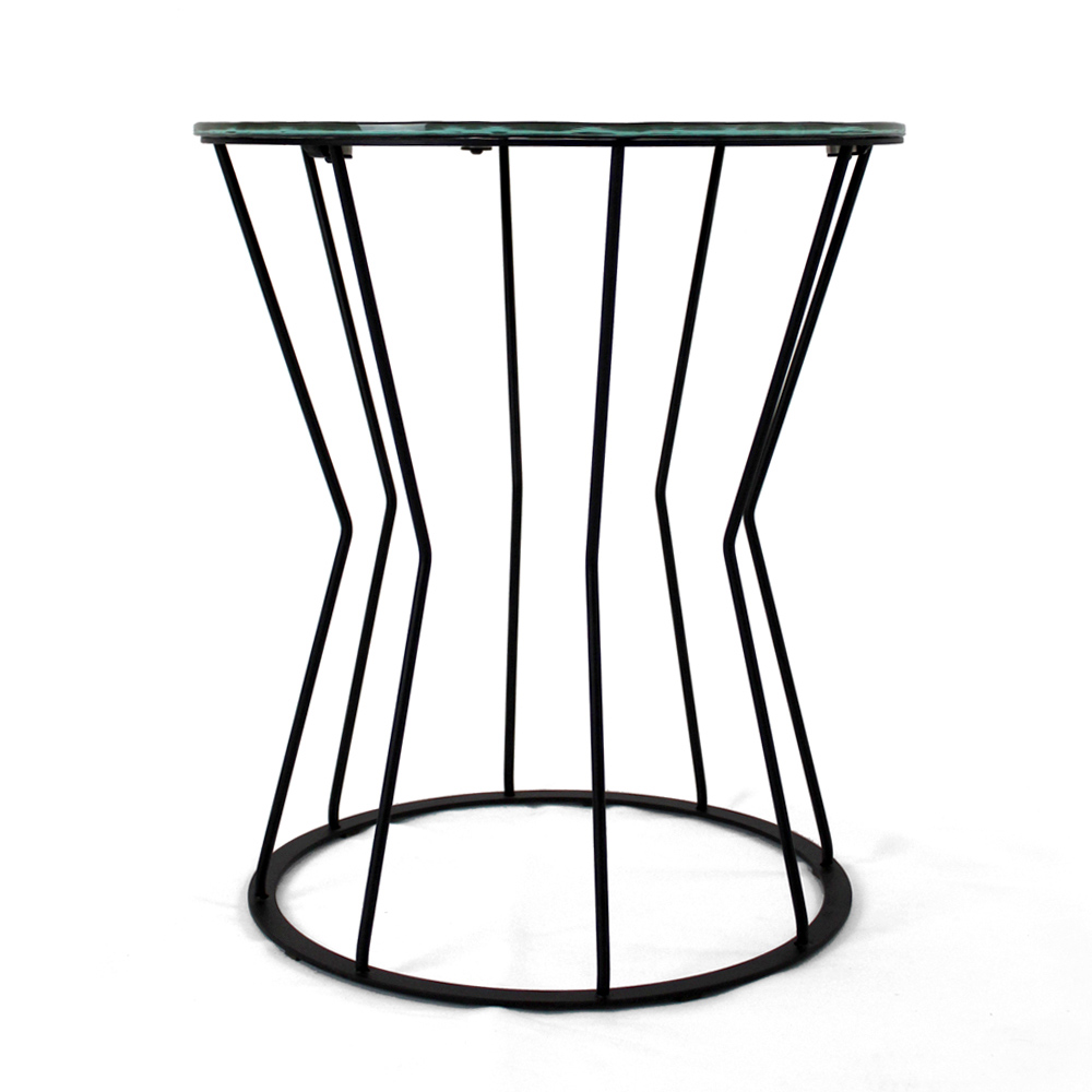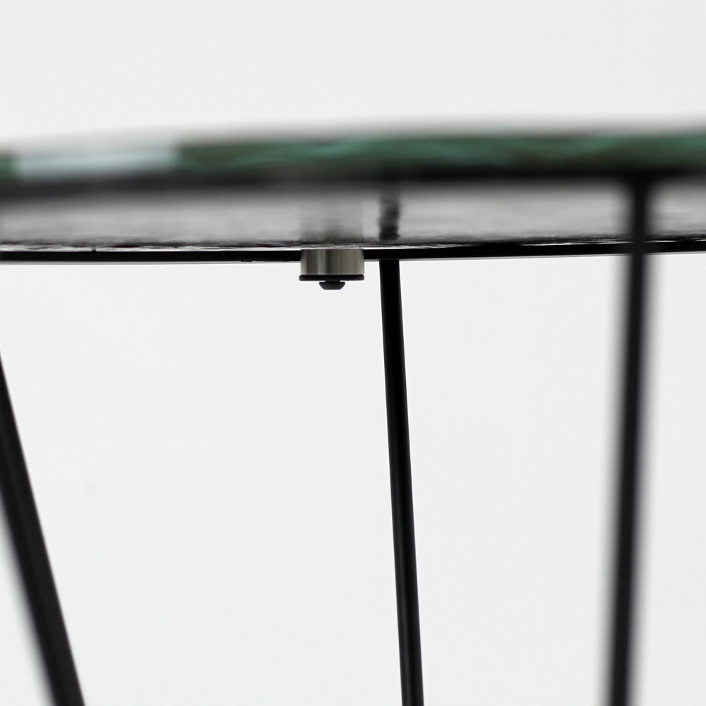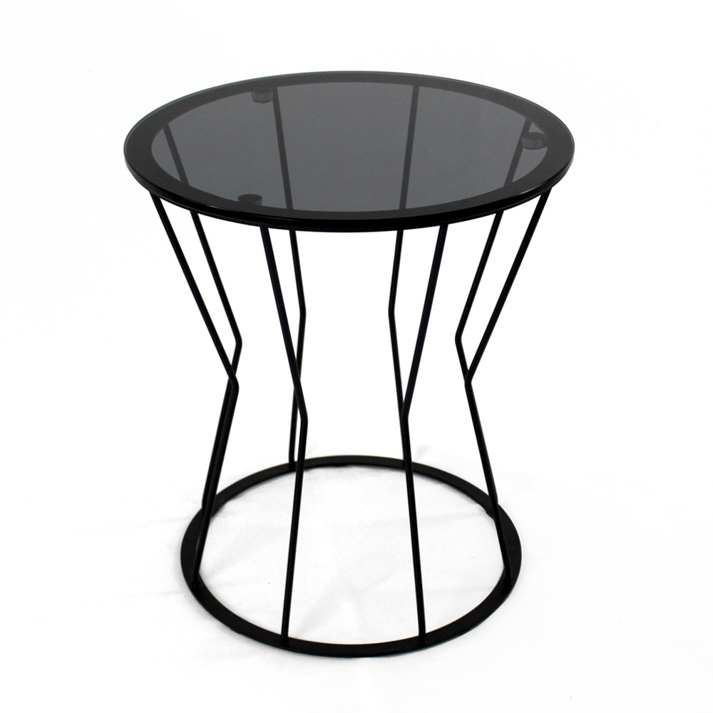 Okrągły stolik kawowy z malowaną stalową podstawą i szklany blat.