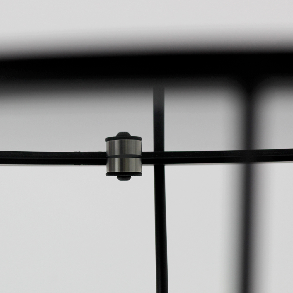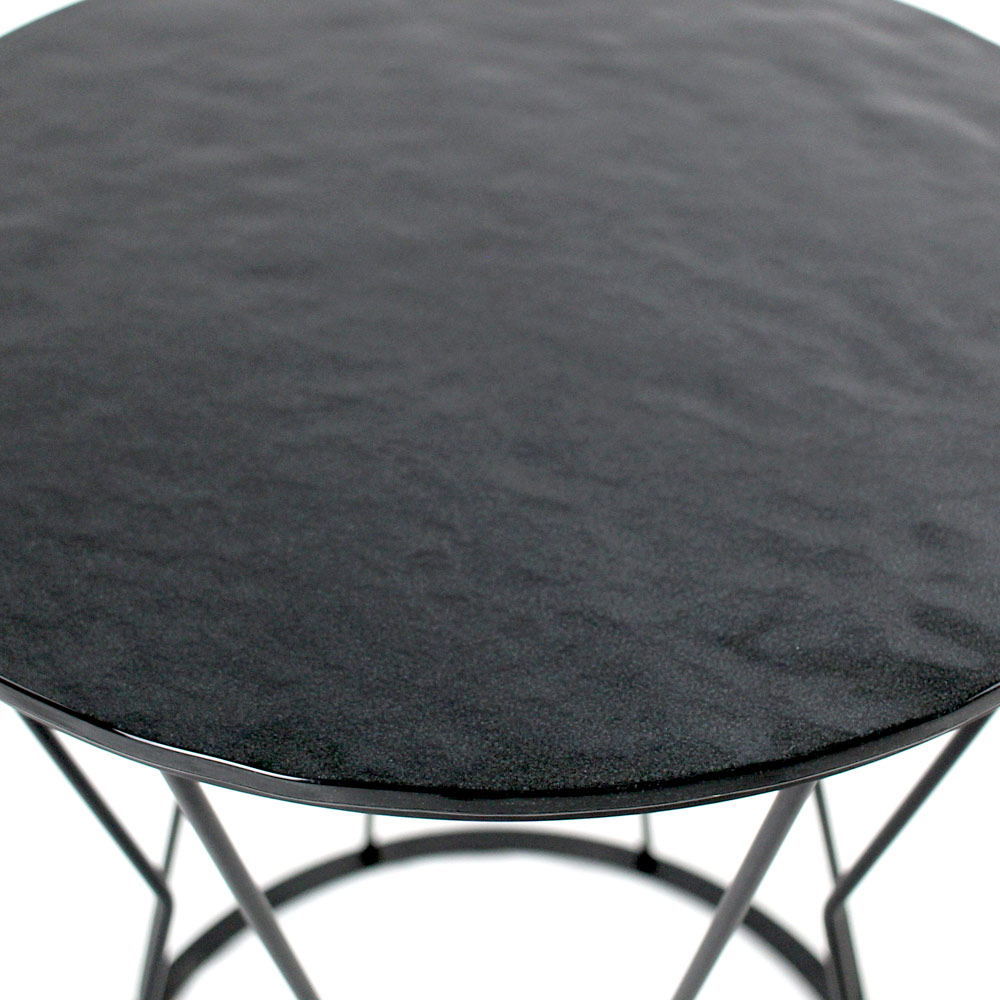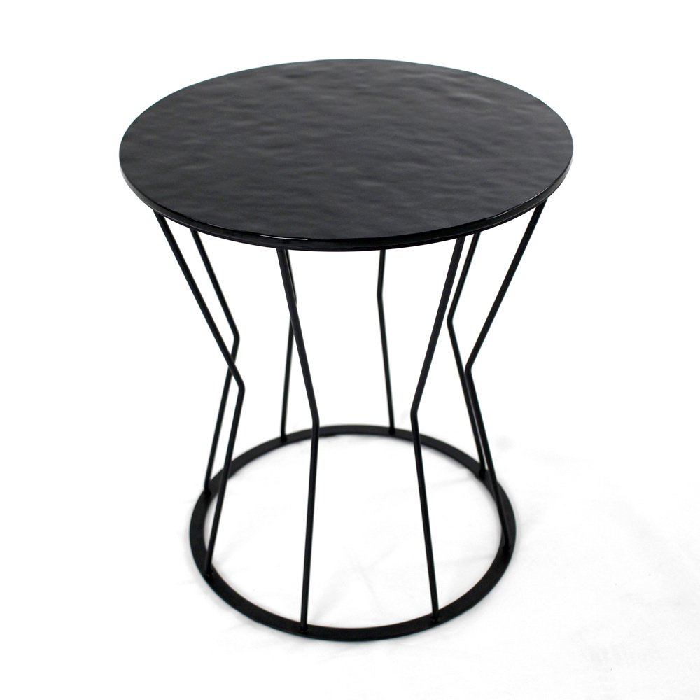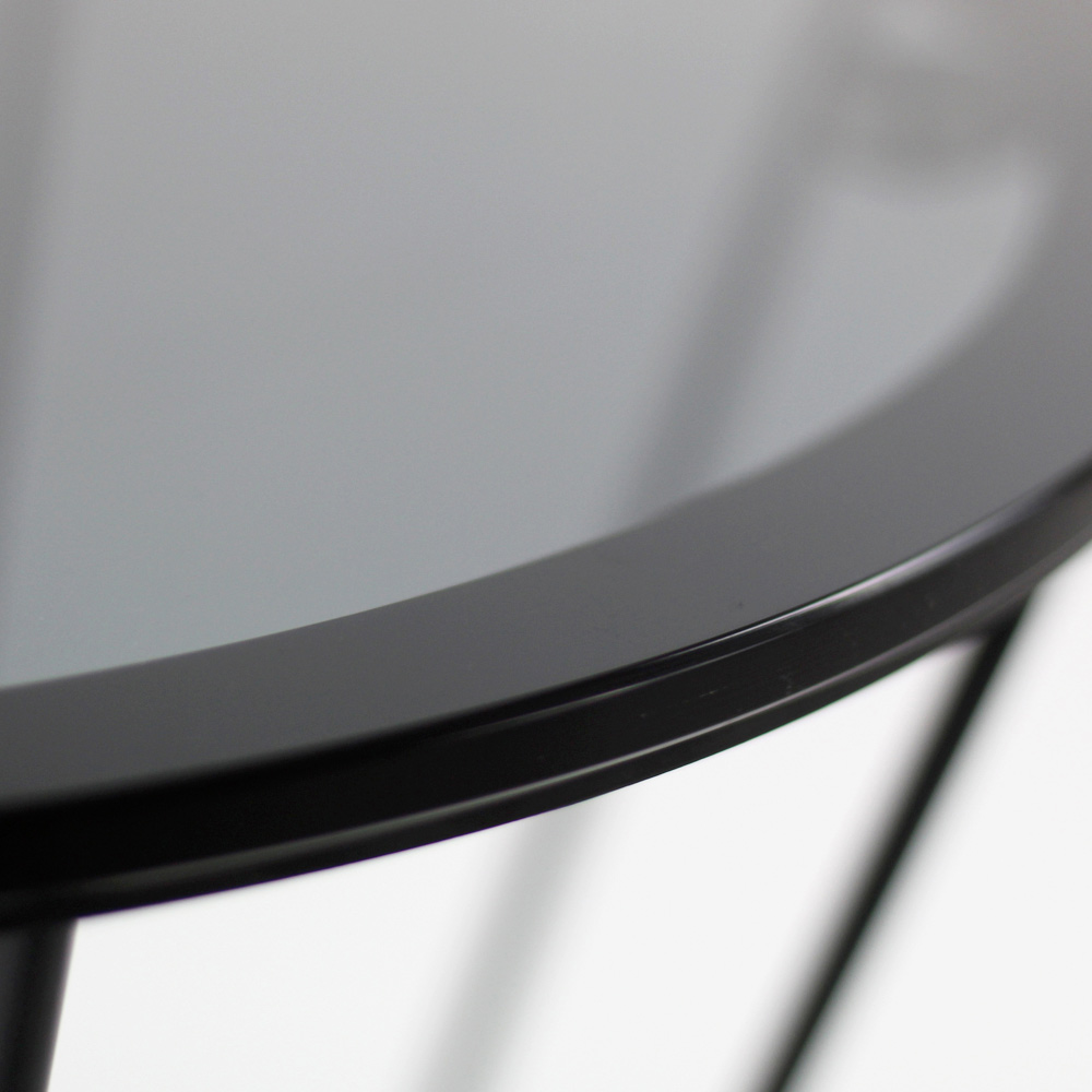 Okrągły stolik kawowy z malowaną stalową podstawą i szklany blat.