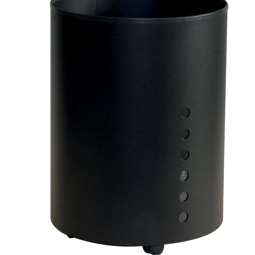 Perforacje na bokach stanowią nie tylko element dekoracyjny, ale służą także do wskazania poziomu pelletu, utrzymując paliwo w optymalnym stanie. Kółka znajdujące się w podstawie ułatwiają przemieszczanie pojemnika, dzięki czemu można go praktycznie bez wysiłku zatankować do kominka lub pieca.