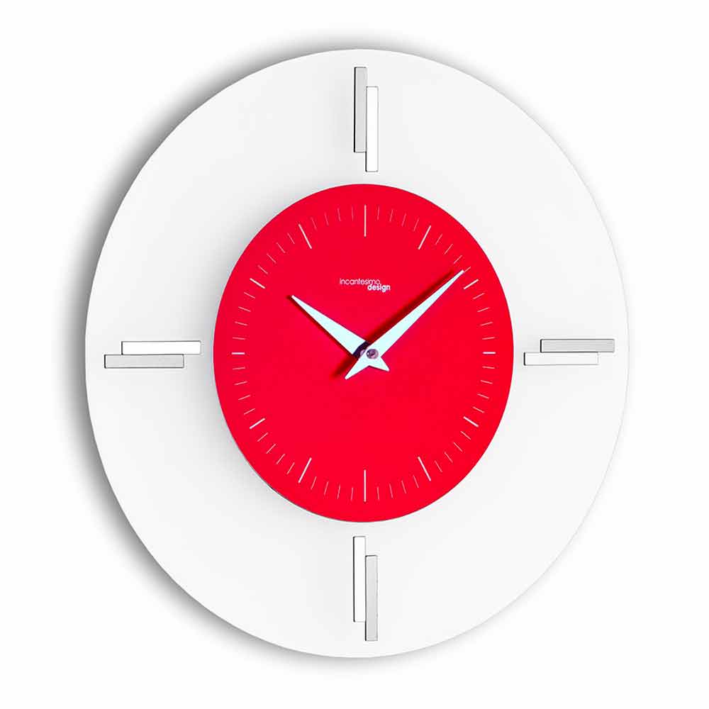 Okrągły zegar ścienny z metakrylanu i aluminium wyprodukowany we Włoszech.