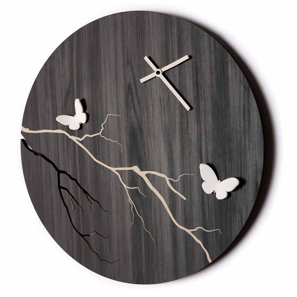 Okrągły drewniany zegar ścienny z grawerowanymi laserowo dekoracjami i trójwymiarowymi motylami, wyprodukowany we Włoszech.