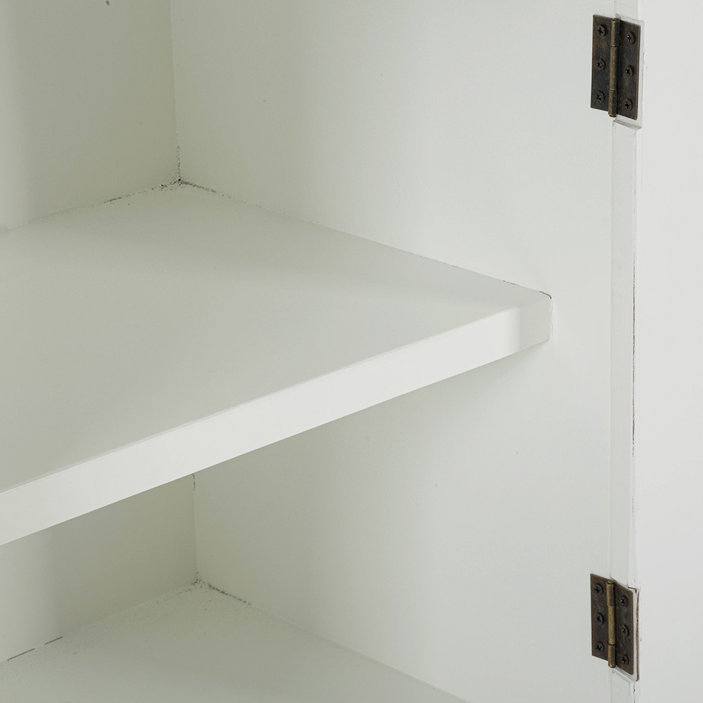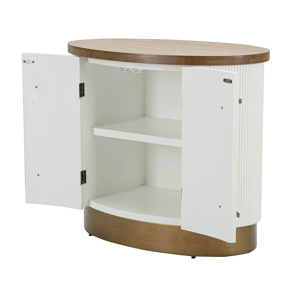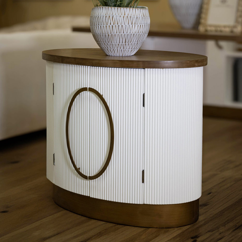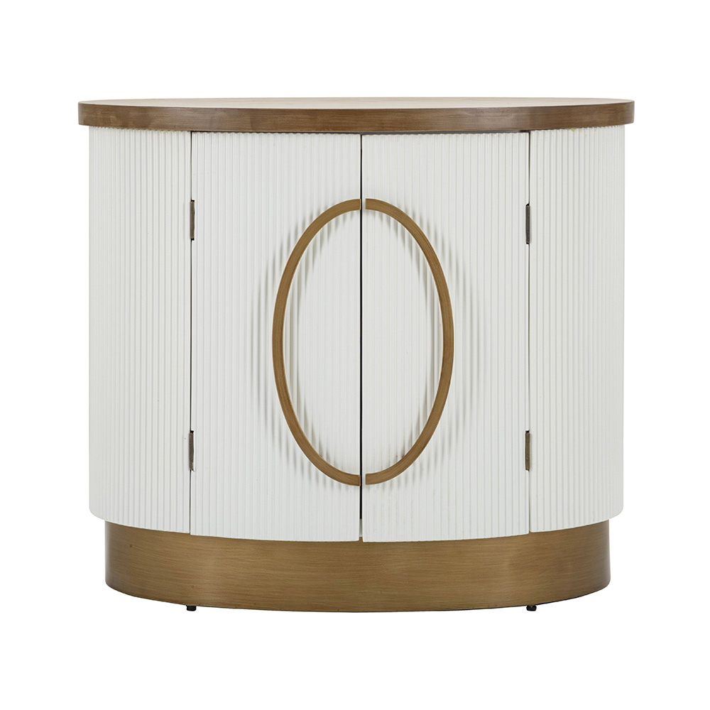 Pomysłowe rowki na drzwiach dodają delikatnej gry światła i cienia, a okrągłe uchwyty wprowadzają odrobinę wyrafinowania . Mebel ten oferuje nie tylko walory estetyczne, ale także dużą pojemność do przechowywania, dzięki czemu jest zarówno praktyczny, jak i piękny.