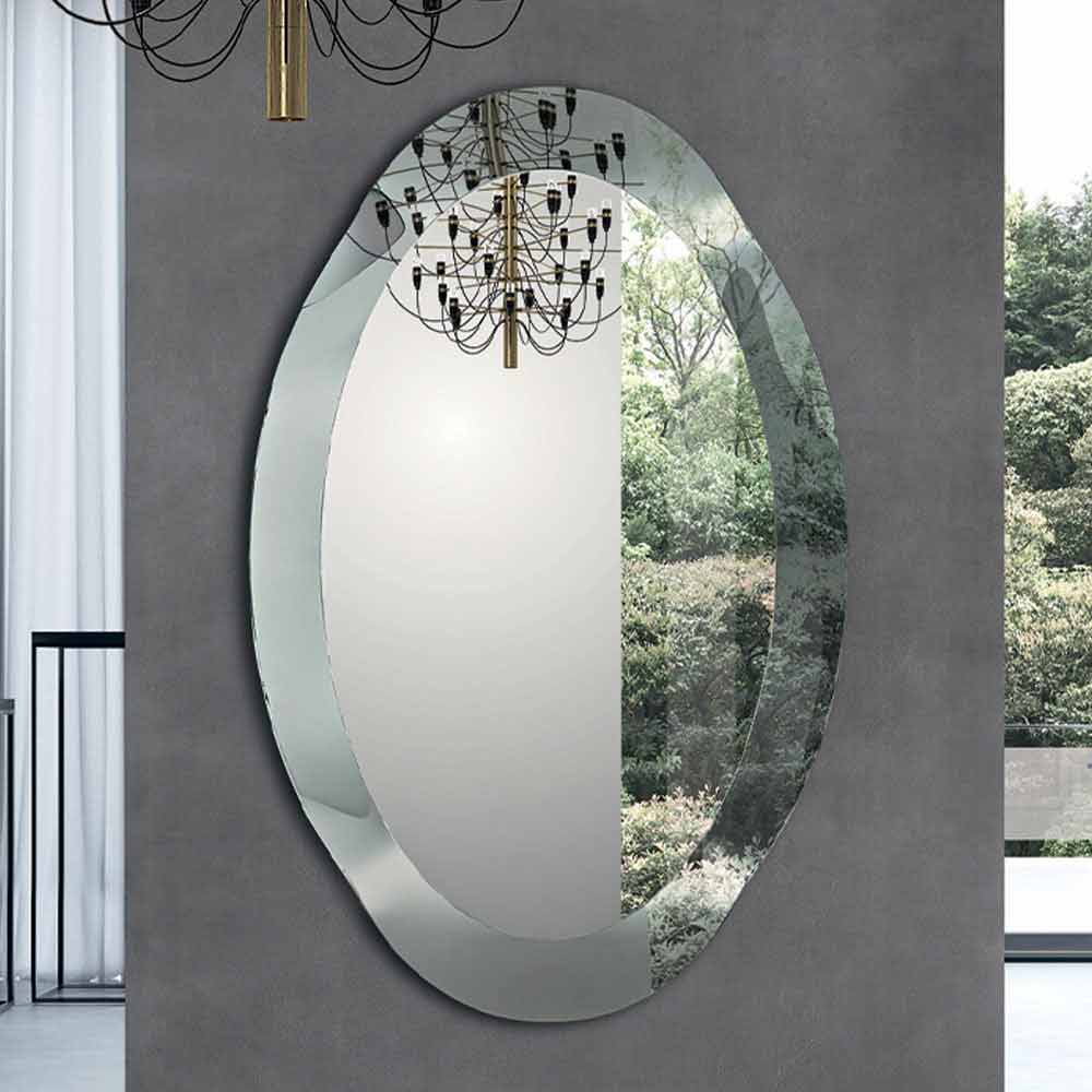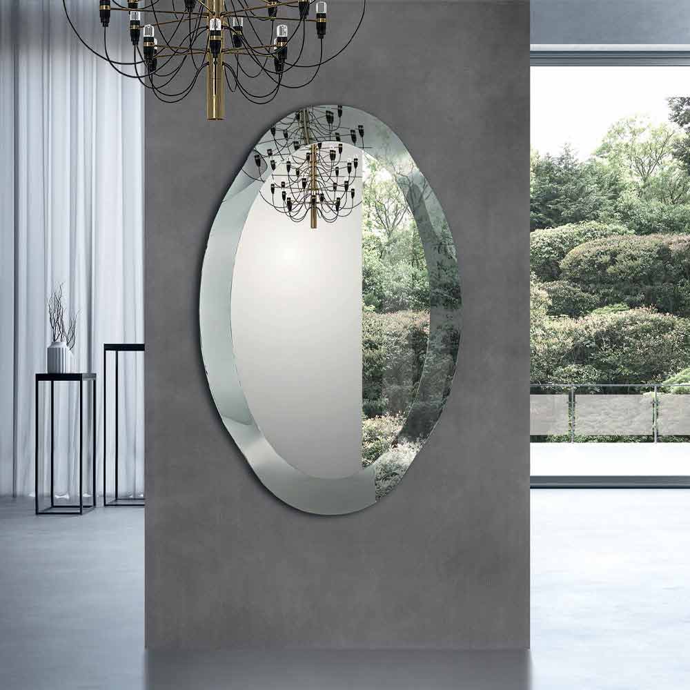 Owalnelustro ścienne wykonane we Włoszech z lustrem wewnętrznym i zakrzywioną szklaną ramą o grubości 6 mm z lustrzanym kryształowym wykończeniem. Projekt tego akcesorium meblowego jest prosty i niezwykle minimalistyczny , ale został wzbogacony i uczyniony wyjątkowym dzięki wspaniałym wykończeniom i nieregularnej strukturze ramy, która nadaje produktowi ruch i oryginalność. Rezultatem jest nowoczesne i eleganckie lustro, idealne do umieszczenia w równie nowoczesnych środowiskach, które wymagają odrobiny klasy i stylu .