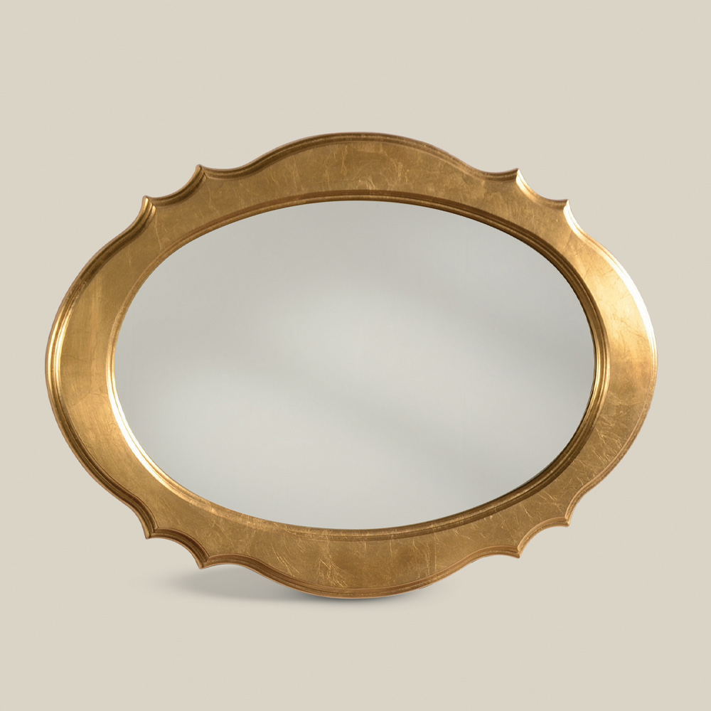 Klasyczne lustro ścienne w kształcie owalu z ramą wykonaną z drewna i ozdobioną eleganckim złotym płatem , idealne do ozdabiania salonu z osobowością i smakiem. Unikalne i wyrafinowane uzupełnienie, w całości wykonane we Włoszech przez wykwalifikowanych mistrzów rzemiosła , mistrzów sztuki, którzy każde uzupełnienie kończą mądrością i zamiłowaniem do elegancji. Produkcja odbywa się przy użyciu szlachetnych materiałów , a prace wykonujemy ręcznie z najwyższą starannością i profesjonalizmem, który wyróżnia produkty Made in Italy .