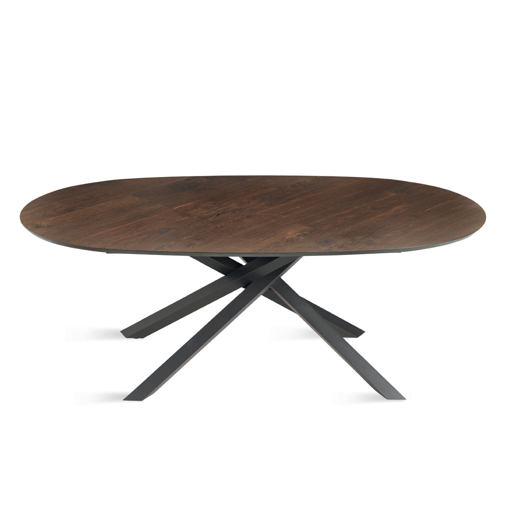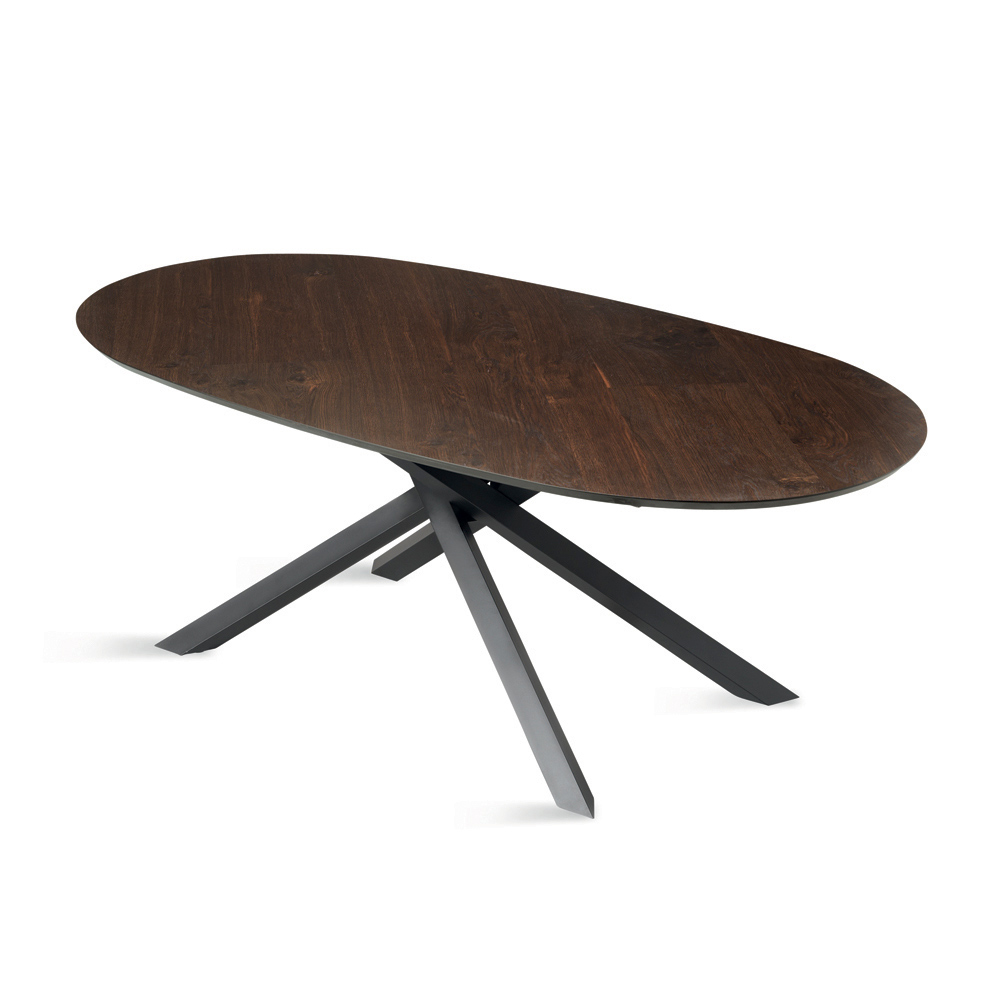 Elegancki, designerski stół jadalny Made in Italy, zaprojektowany z myślą o stylowym umeblowaniu jadalni lub salonu . Stół wyróżnia się eleganckim, owalnym blatem z forniru dębowego o miękkim profilu, który sprzyja towarzyskiej atmosferze i dodaje przestrzeni naturalnej elegancji.