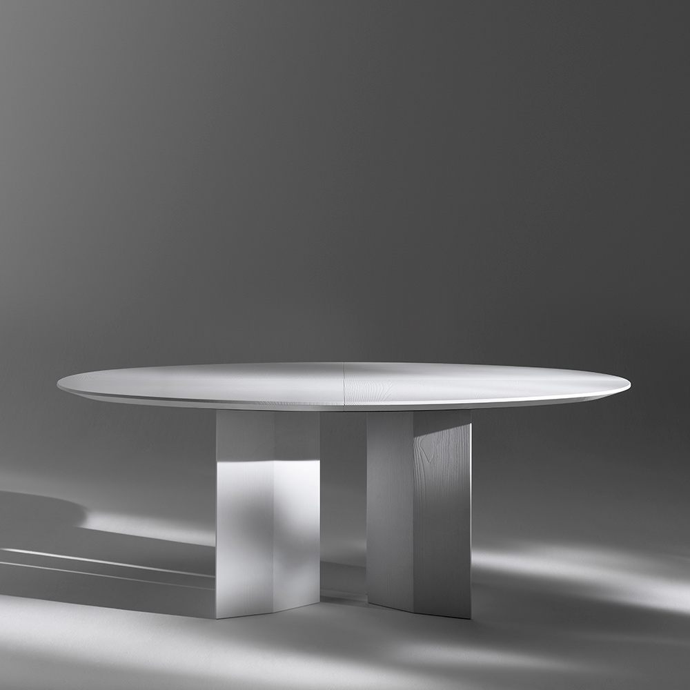 Ten owalny stół jadalny wyróżnia się rzeźbiarskim i prostym designem, w którym pełne bryły i zrównoważone proporcje tworzą efektowny mebel. Owalny blat współgra z centralną podstawą, tworząc solidną i harmonijną kompozycję, zaprojektowaną z myślą o nowoczesnych i eleganckich wnętrzach.