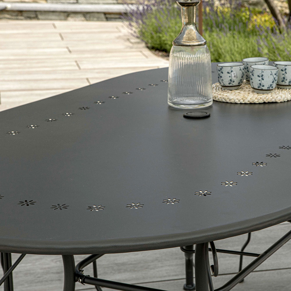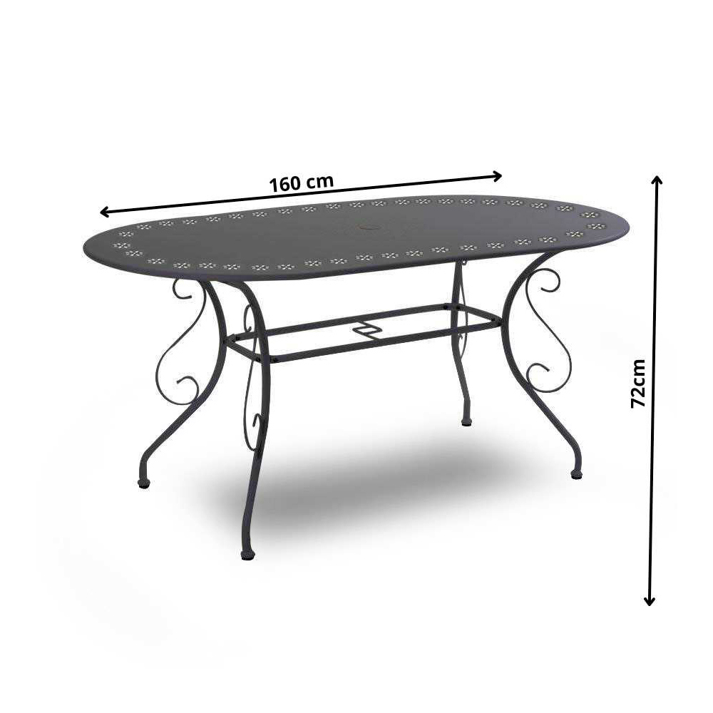 Ten owalny metalowy stół jest idealnym wyborem dla tych, którzy lubią łączyć praktyczność i styl. Dzięki solidnej ramie i eleganckim, zakrzywionym nogom, stanowi on idealne miejsce spotkań podczas wspólnych chwil na świeżym powietrzu.