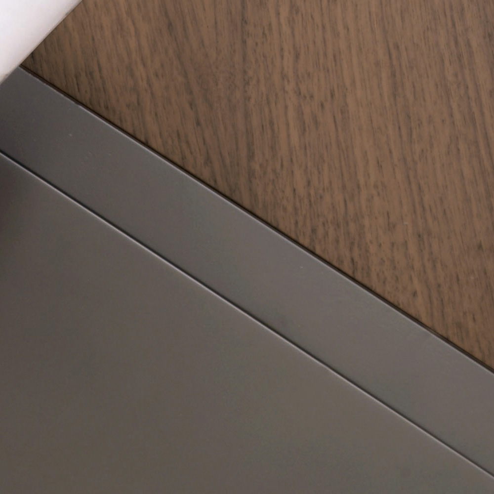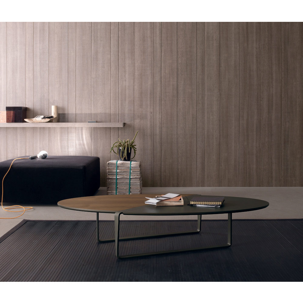 Ten owalny stolik kawowy ma wytłaczaną metalową podstawę malowaną proszkowo grafitem i dwukolorowy drewniany blat w okleinie z orzecha canaletto i drewnie lakierowanym w metalicznym brązie .