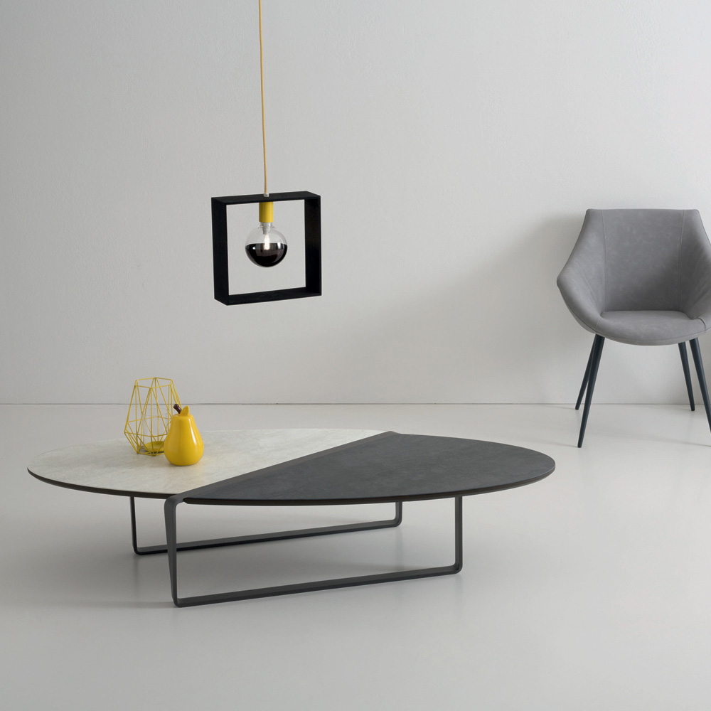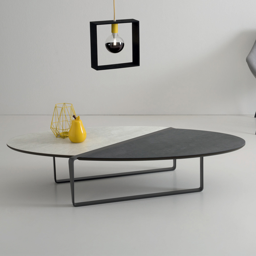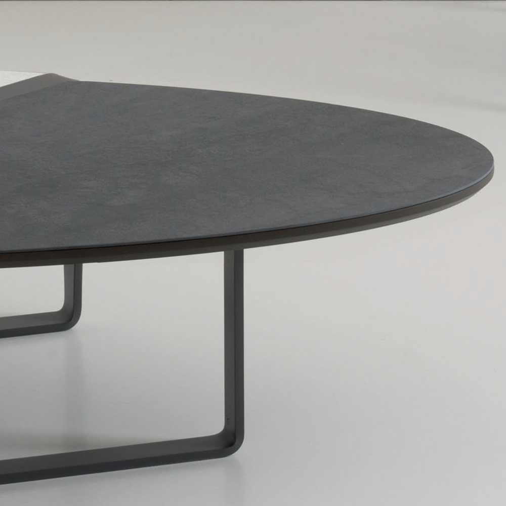 Ten owalny stolik kawowy ma wytłaczaną, grafitową, malowaną proszkowo metalową podstawę i dwukolorowy matowy blat ceramiczny na panelu.