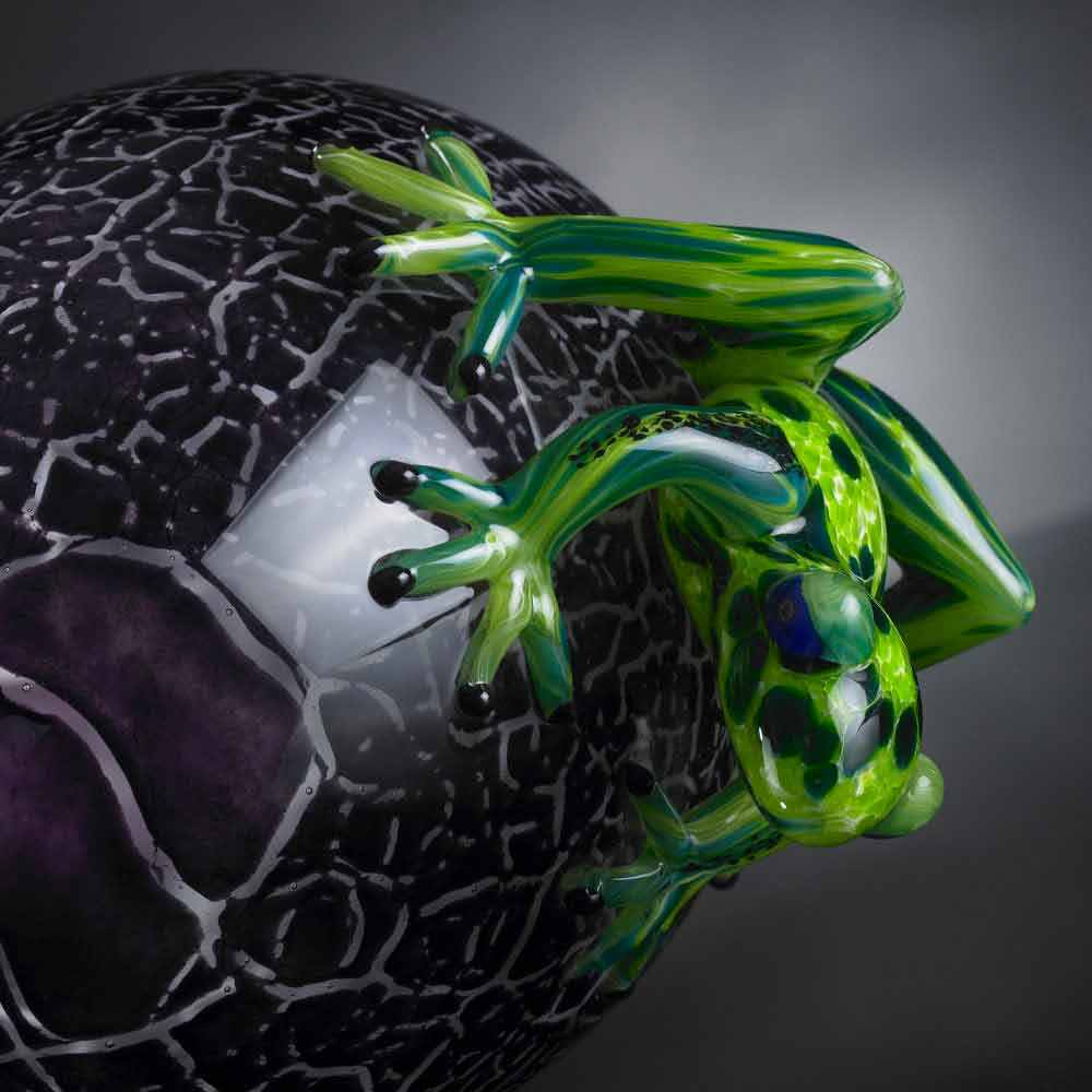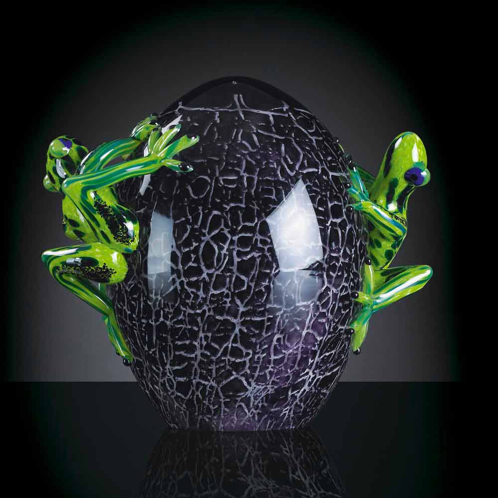 Dekoracyjna statua w kształcie żaby na jajku z kolorowego szkła Made in Italy.