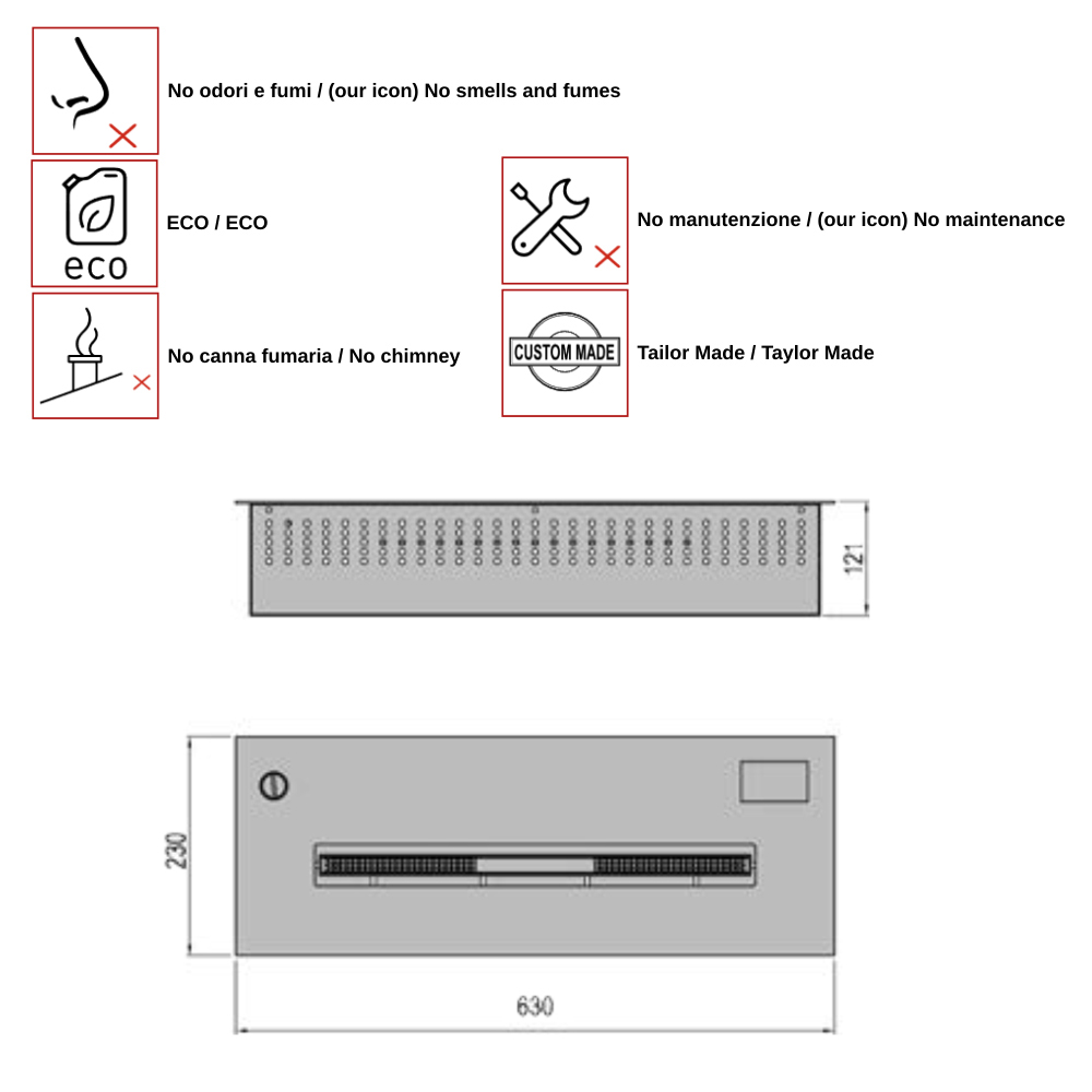 Produkt wykonany ze szczotkowanej stali nierdzewnej, nadaje się do wbudowania na płaskich powierzchniach lub w kominkach ściennych.