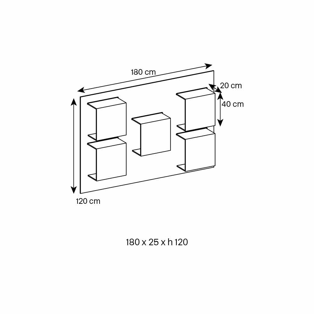 Wykonany z drewnianego panelu w wykończeniu orzech canaletto z 5 przezroczystymi szklanymi półkami, jest dostępny w wersji poziomej lub pionowej.
