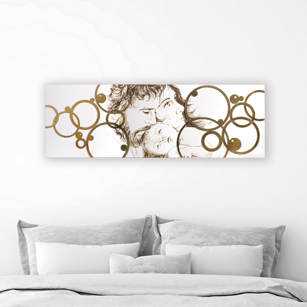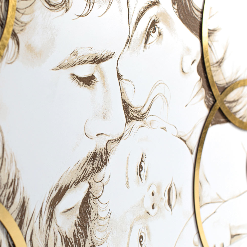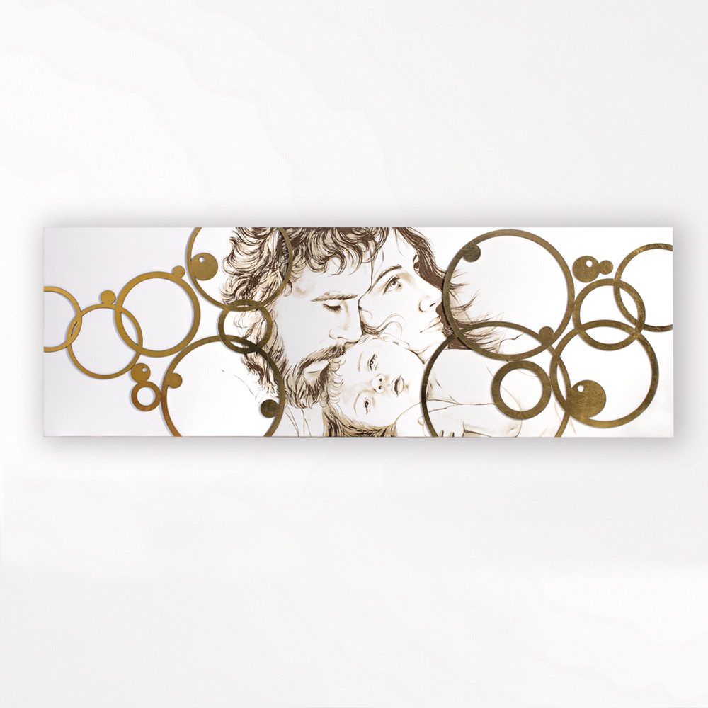 Panel przedstawia Świętą Rodzinę w nowoczesnym stylu . Dekoracje ze złotych liści są nakładane na laserowo znakowany projekt. Drewniany panel lakierowany na biało, ze znakowaniem laserowym, specjalną techniką, która tworzy płaskorzeźbę na materiałach. Aplikacje wykonane są ze złota płatkowego , specjalną cenną techniką.