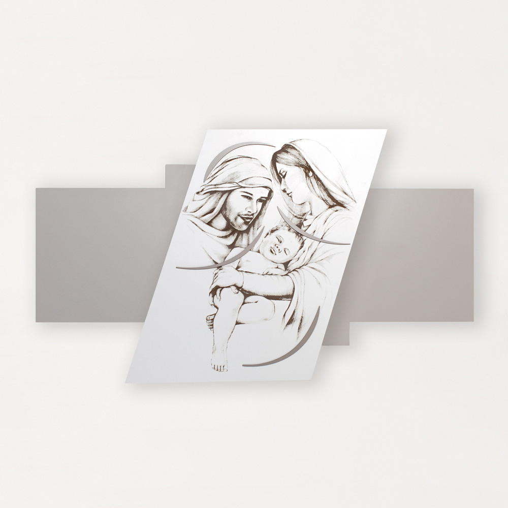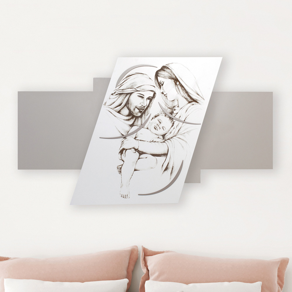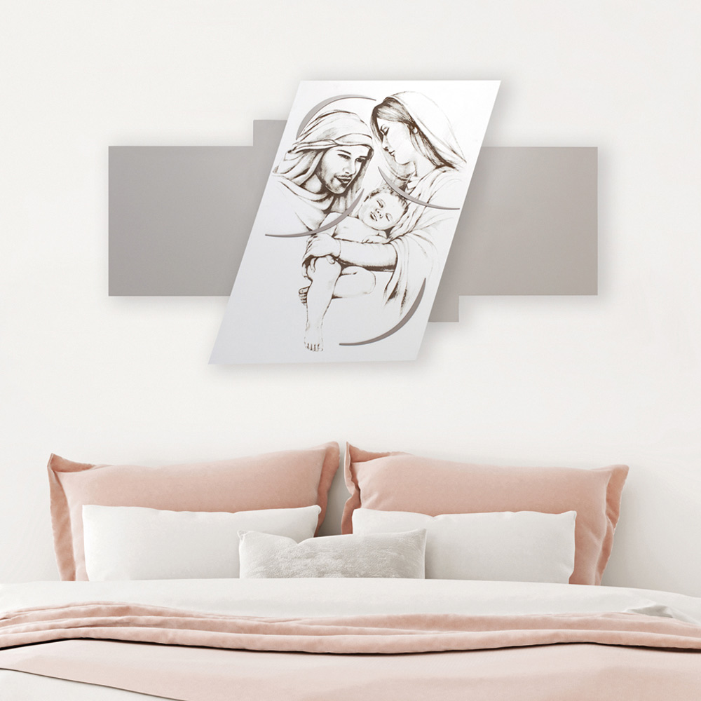 Reprezentuje Świętą Rodzinę w znakowaniu laserowym, jest zagłówkiem o minimalistycznym designie, idealnym do nowoczesnych wnętrz. Grawerowany laserowo , nieprzezroczysty biały lakierowany drewniany panel na kamykowym panelu z dekoracjami ze żwiru przedstawiającymi scenę religijną.