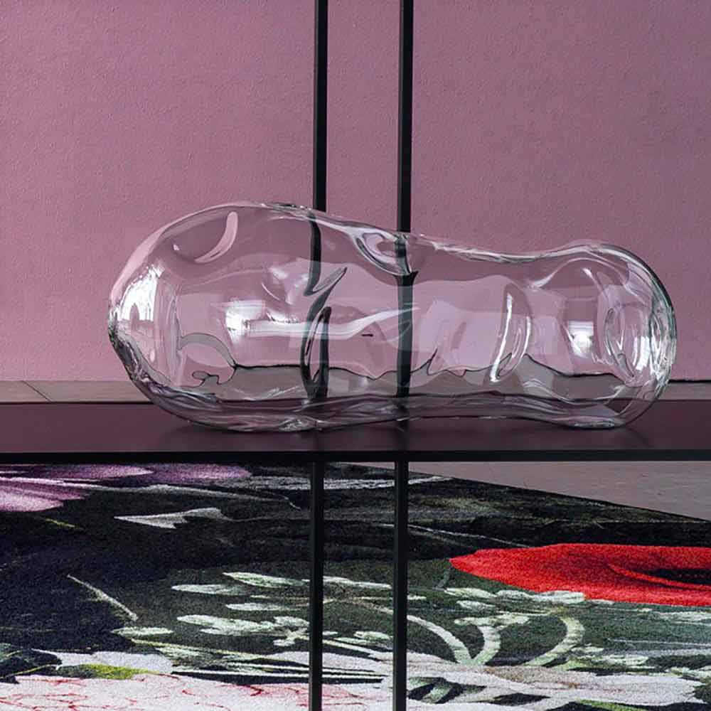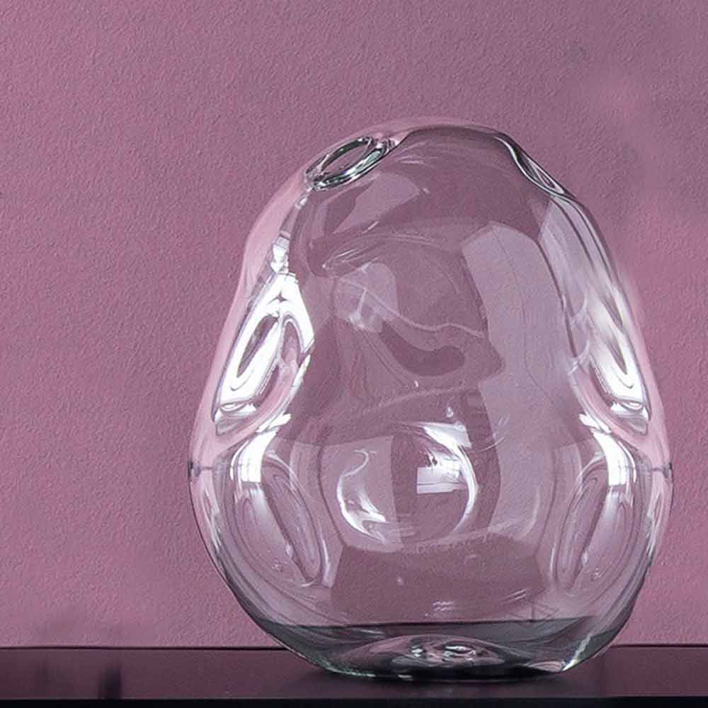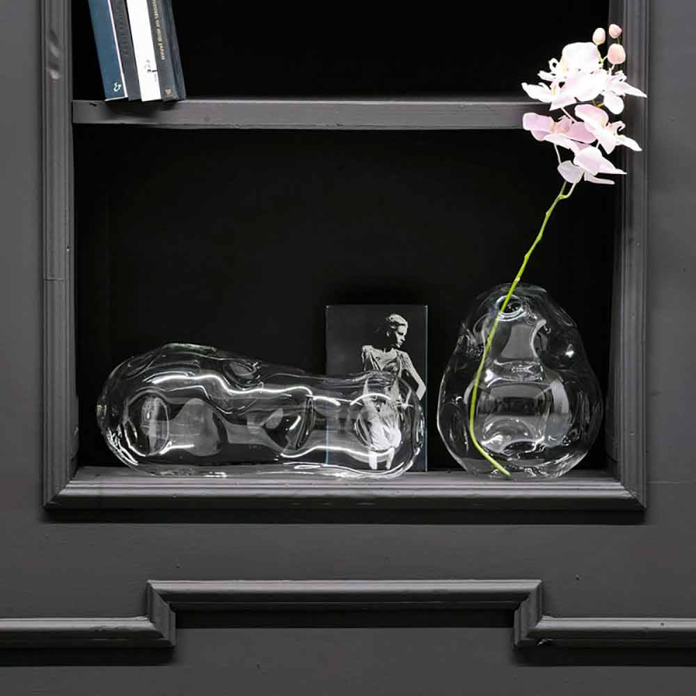 Oryginalna para dekoracyjnych wazonów wyprodukowanych we Włoszech z przezroczystego dmuchanego szkła o ekscentrycznym wzorze. Oryginalność, kreatywność i elegancja to szczególne cechy tej kompozycji nowoczesnych wazonów, które łączą się, aby ożywić