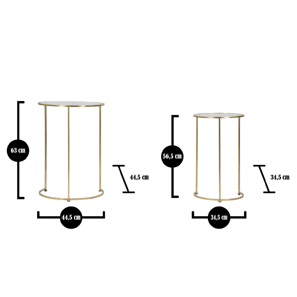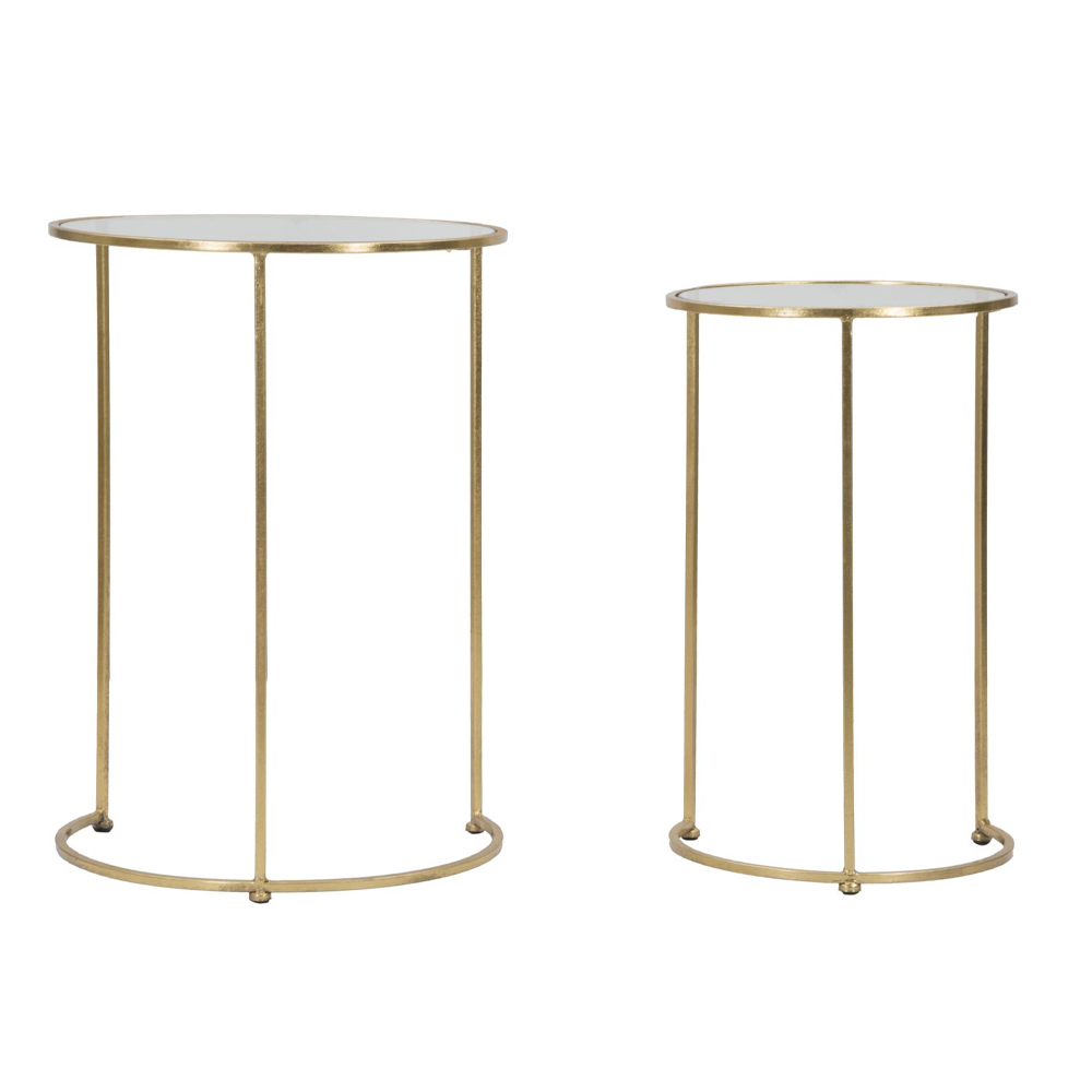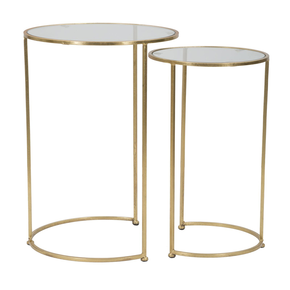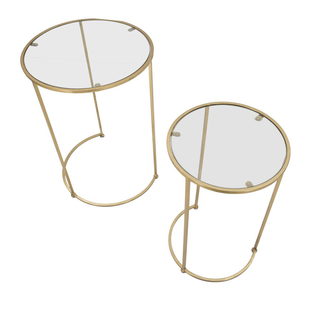 Para stolików z pozłacanego żelaza z okrągłym szklanym blatem.