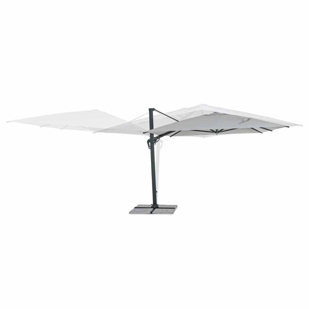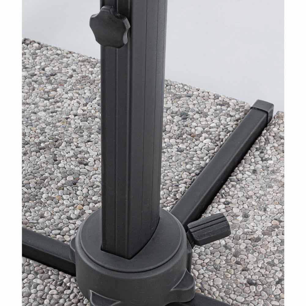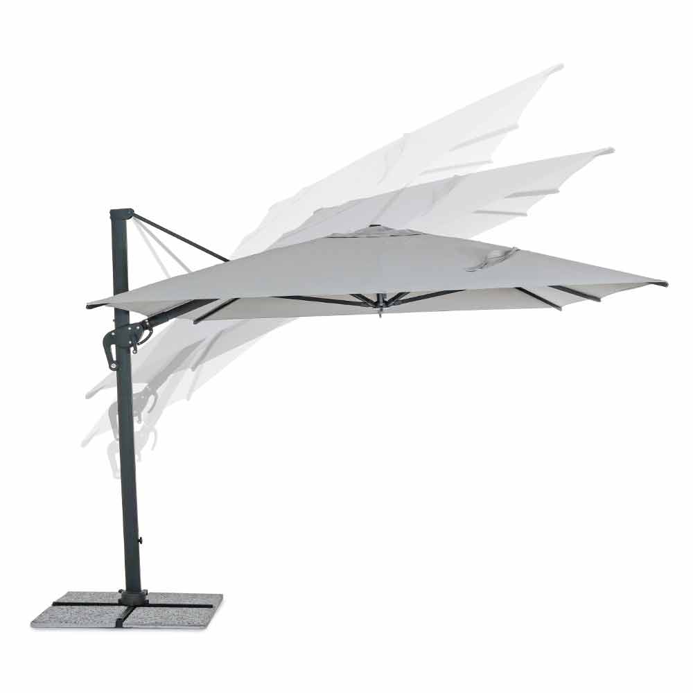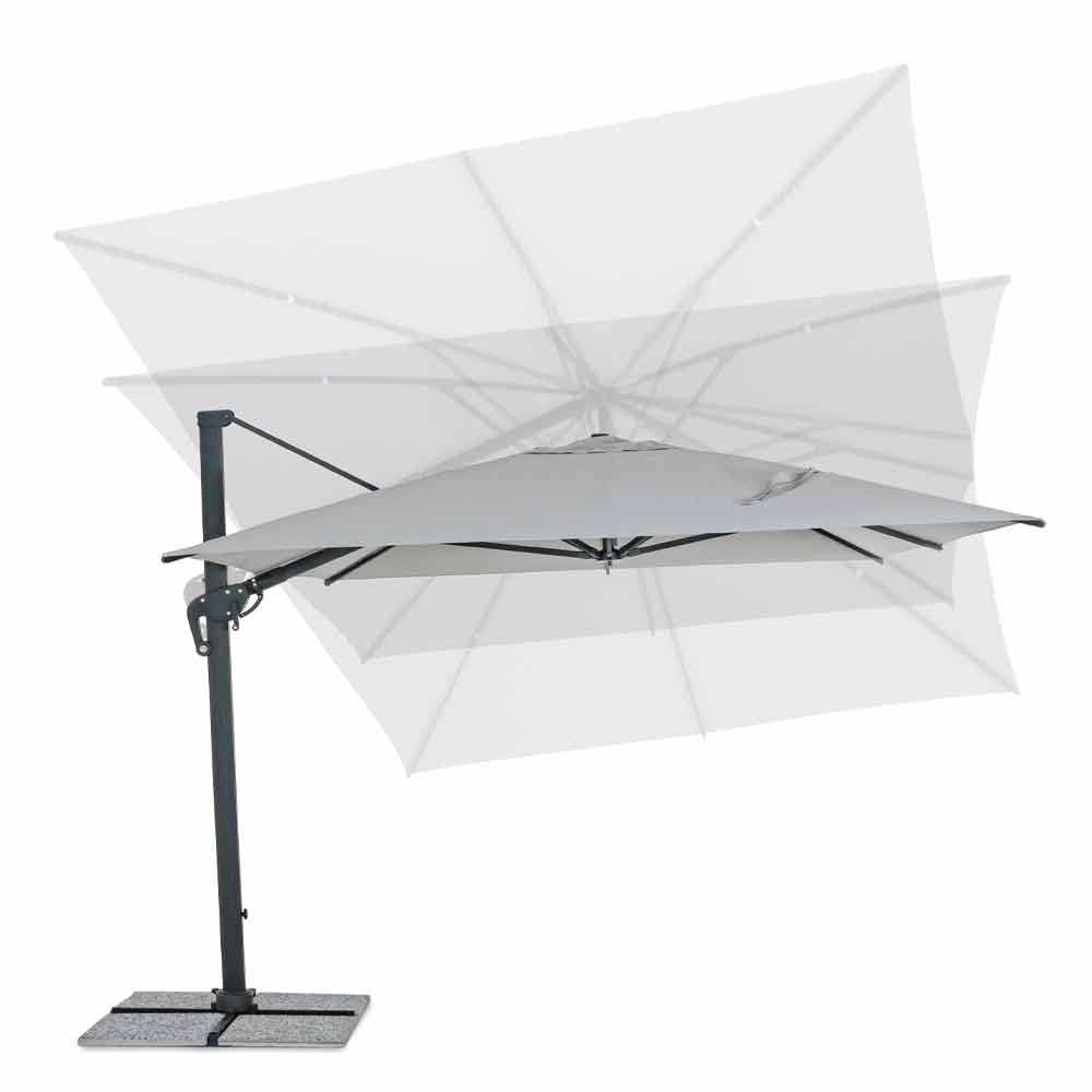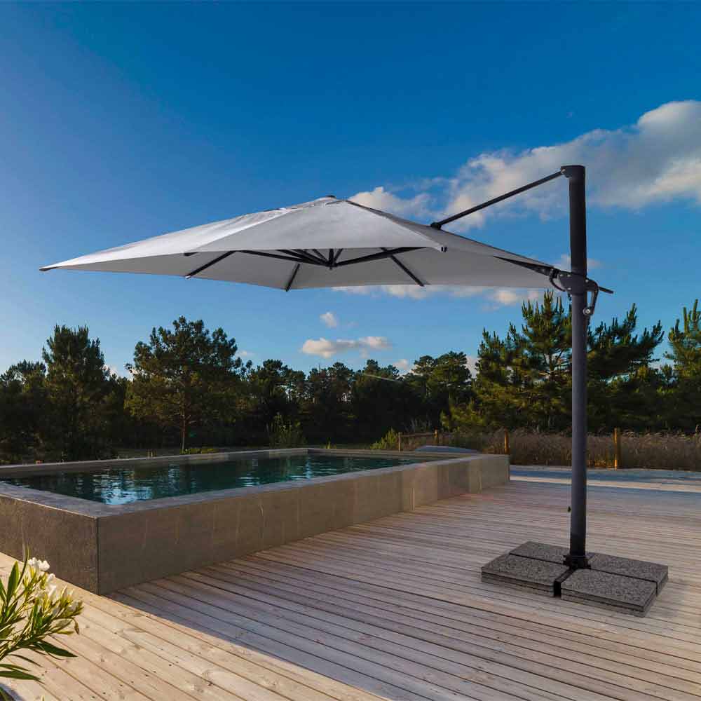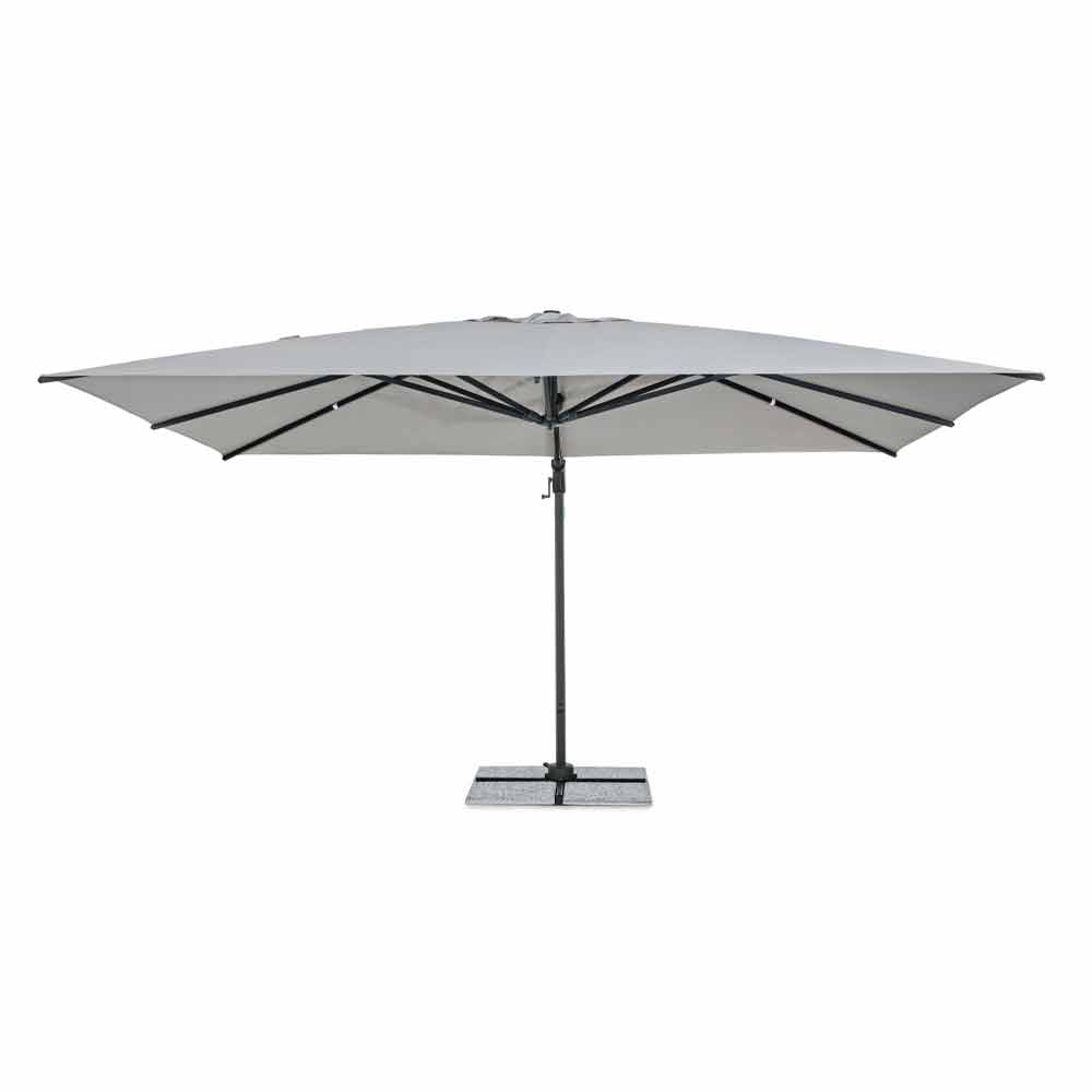Konstrukcja aluminiowa malowana proszkowo (poliester). Tyczka 93x57mm. 8 żeber 28x18mm. Jasnoszara tkanina poliestrowa 250 g / m2 z powłoką pa (poliamid). Podstawa krzyżowa ze stali . Tyczka obrotowa 360 ° z pedałem. Pochylenie w pionie z 5-pozycyjną rączką. Wyposażony w uchwyt do odchylania parasola w prawo-lewo.