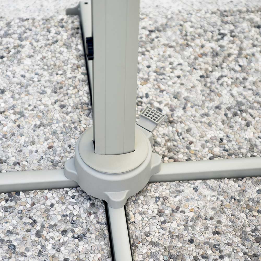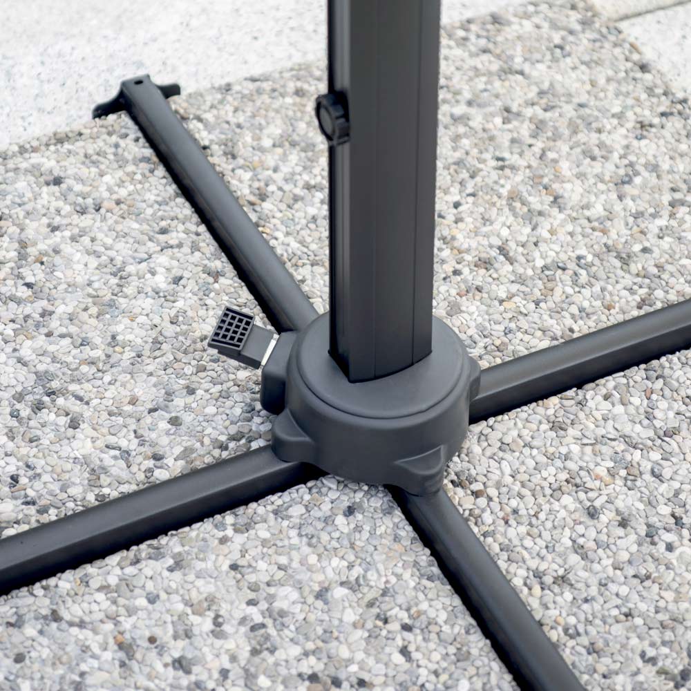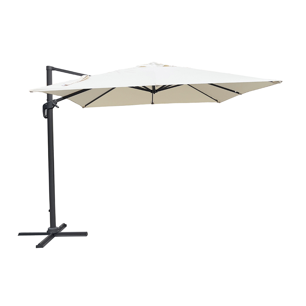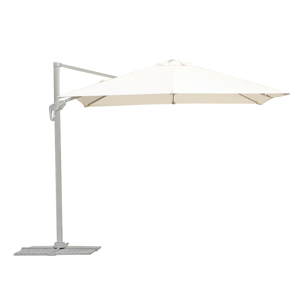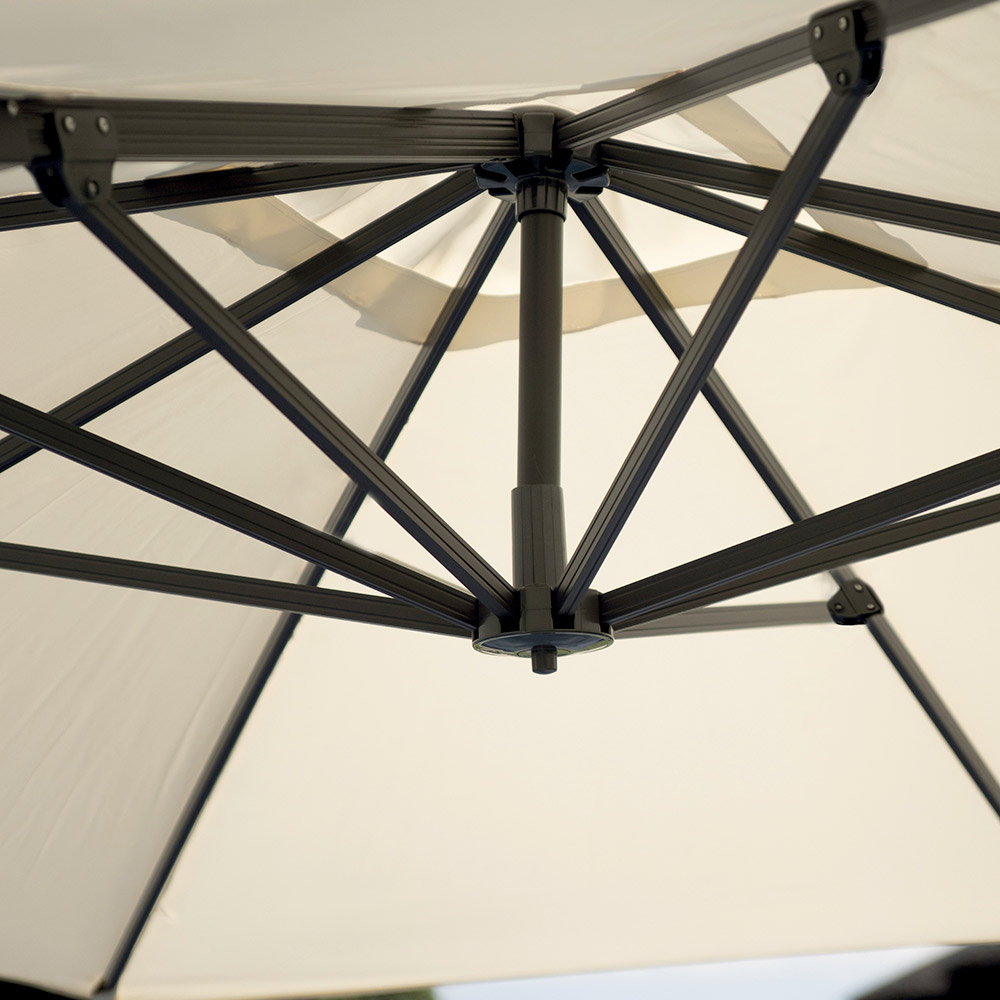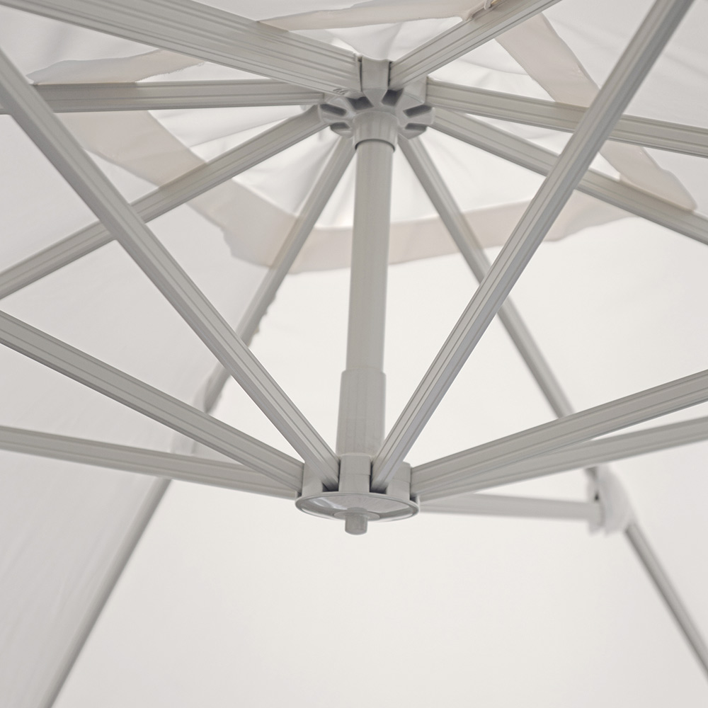 Poszycie z poliestru w kolorze ecru o gramaturze 250 g zapewnia doskonałą ochronę przed promieniami słonecznymi i jest wysoce odporne na warunki atmosferyczne, tworząc przestronną i przytulną strefę zacienioną. Dzięki systemowi obrotu o 360° parasol można łatwo dostosować do pozycji słońca, zapewniając zawsze maksymalną osłonę i komfort.