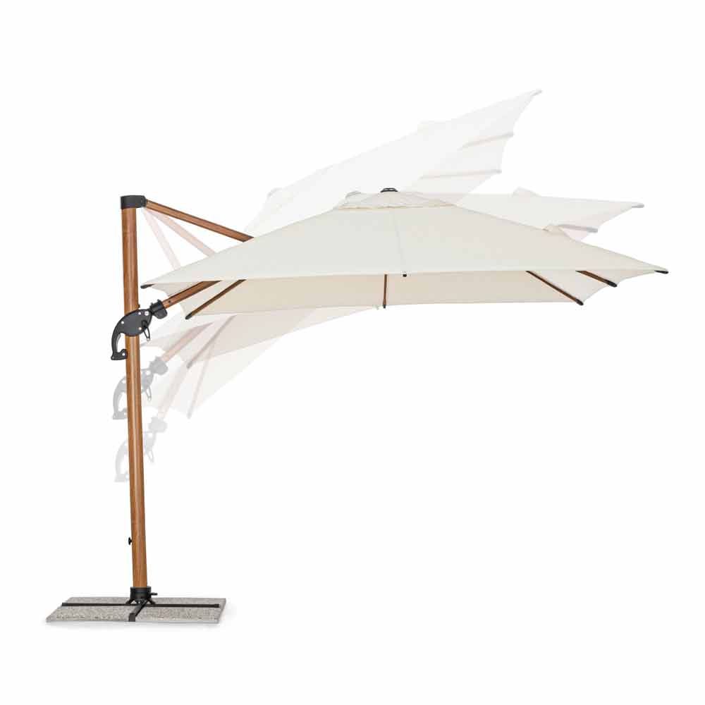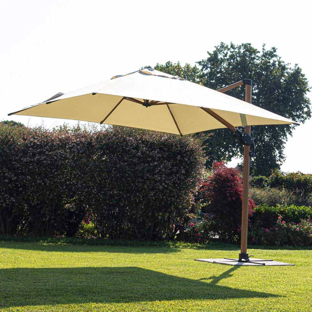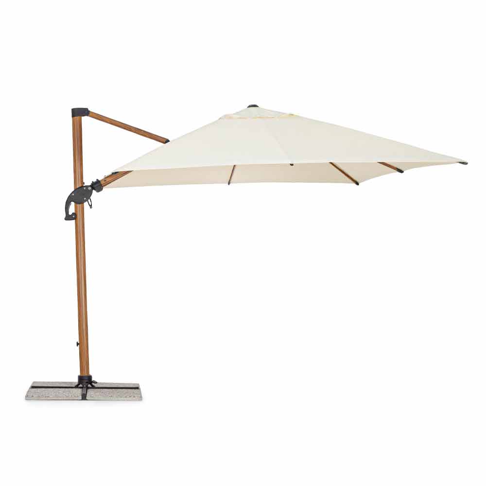 Konstrukcja aluminiowa malowana proszkowo (poliester) z efektem drewna. Słup 90x60mm, 8 żeber 25x17mm. Beżowa tkanina poliestrowa 250 g / m2 z powłoką pa (poliamidową). Podstawa krzyżowa ze stali . Tyczka obrotowa 360 ° z pedałem. Odchylany w pionie z 6-pozycyjną rączką. Wyposażony w system uchylania parasola w prawo-lewo. W zestawie pokrowiec na parasol.
