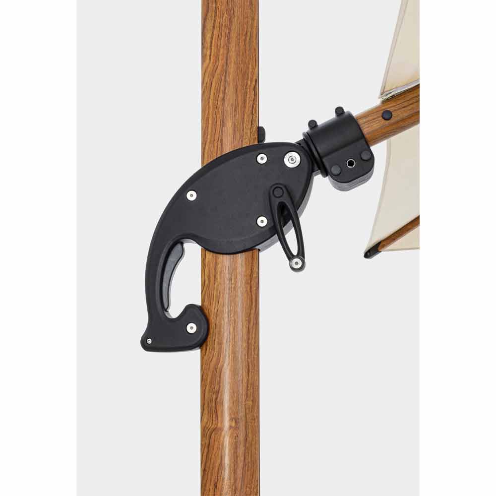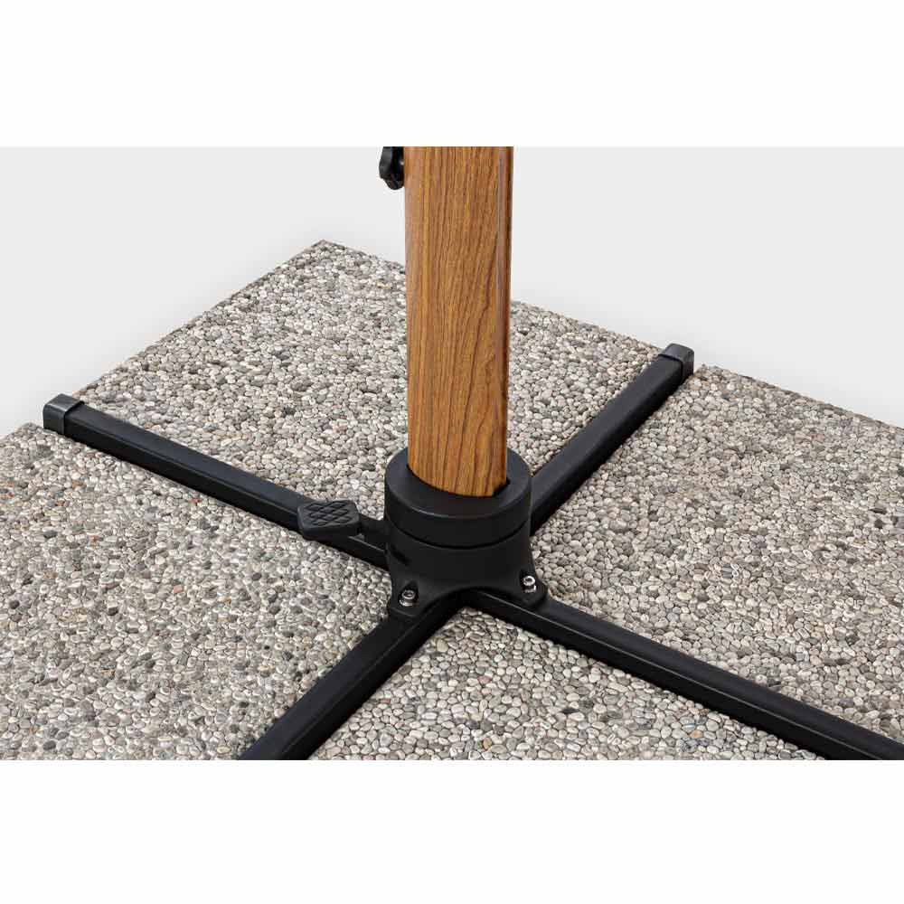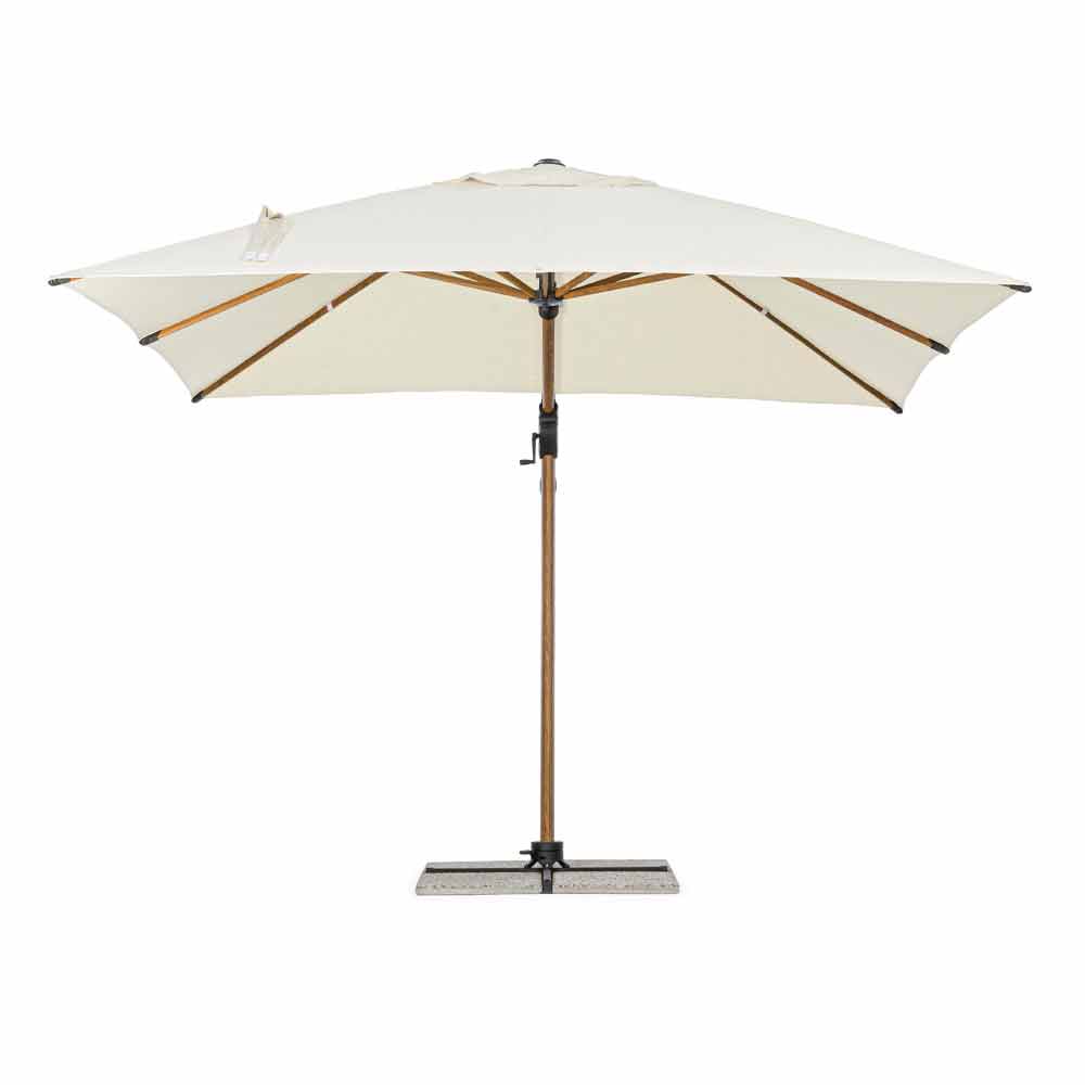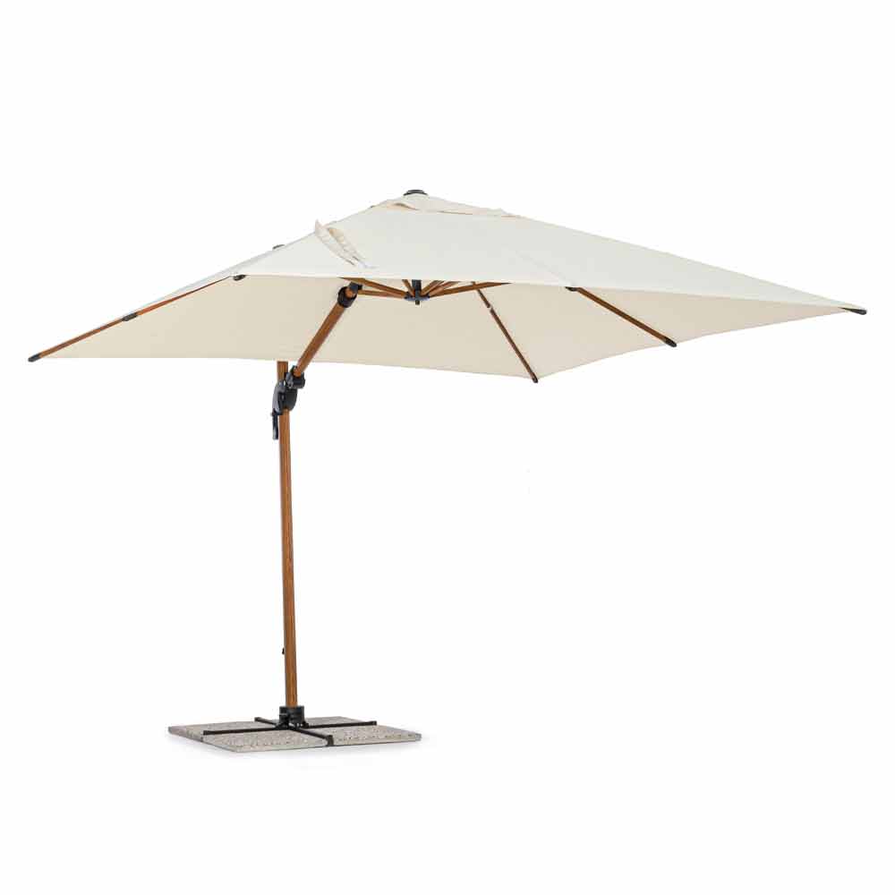 Konstrukcja aluminiowa malowana proszkowo (poliester) z efektem drewna. Słup 90x60mm, 8 żeber 25x17mm. Beżowa tkanina poliestrowa 250 g / m2 z powłoką pa (poliamidową). Podstawa krzyżowa ze stali . Tyczka obrotowa 360 ° z pedałem. Odchylany w pionie z 6-pozycyjną rączką. Wyposażony w system uchylania parasola w prawo-lewo. W zestawie pokrowiec na parasol.