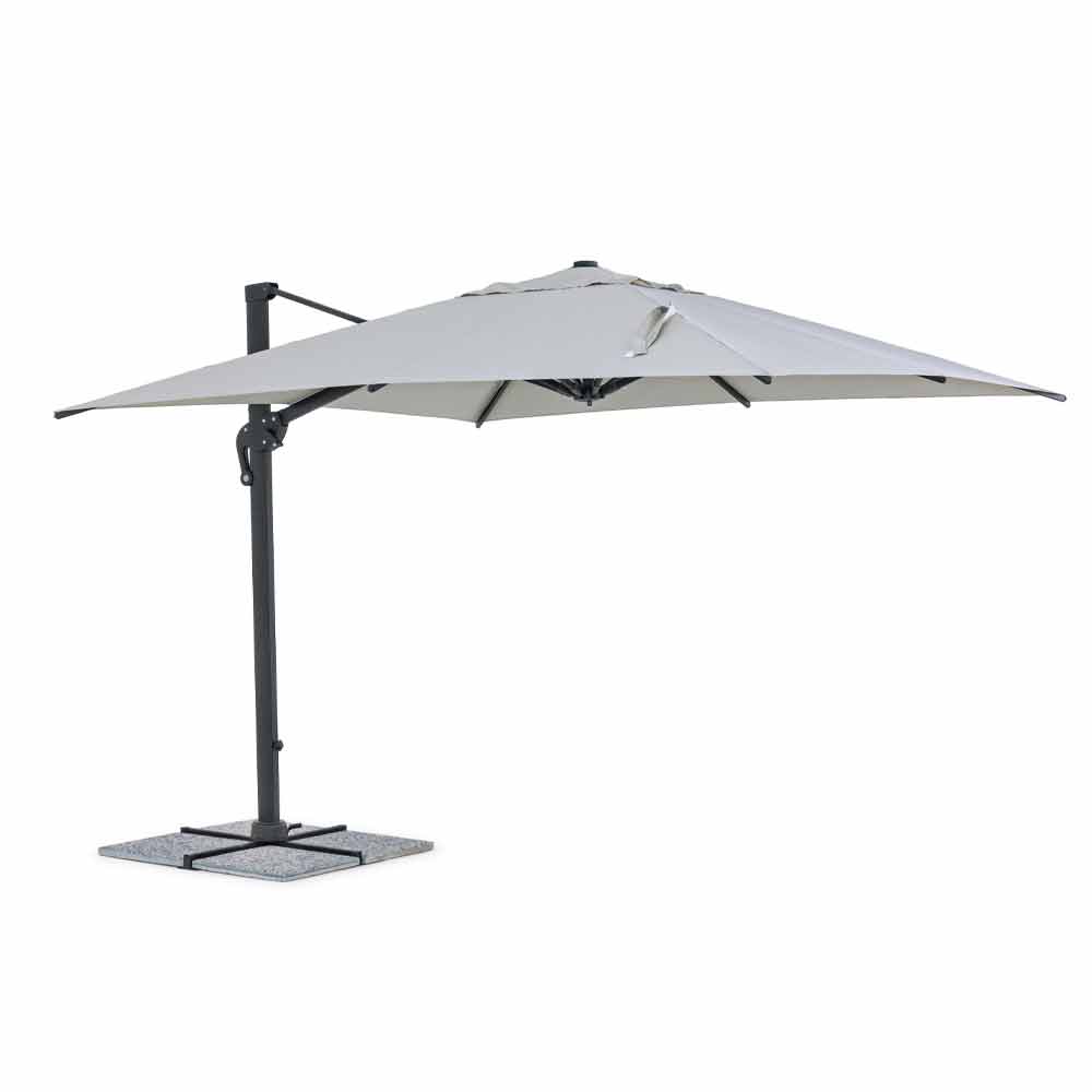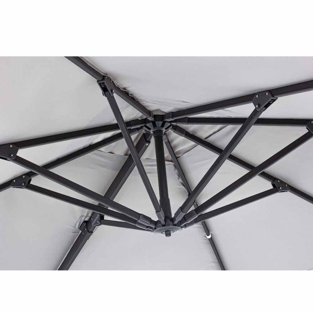 Konstrukcja aluminiowa malowana proszkowo (poliester). Tyczka 93x57mm. 8 żeber 28x18mm. Jasnoszara tkanina poliestrowa 250 g / m2 z powłoką pa (poliamid). Podstawa krzyżowa ze stali . Tyczka obrotowa 360 ° z pedałem. Pochylenie w pionie z 5-pozycyjną rączką. W zestawie pokrowiec na parasol.