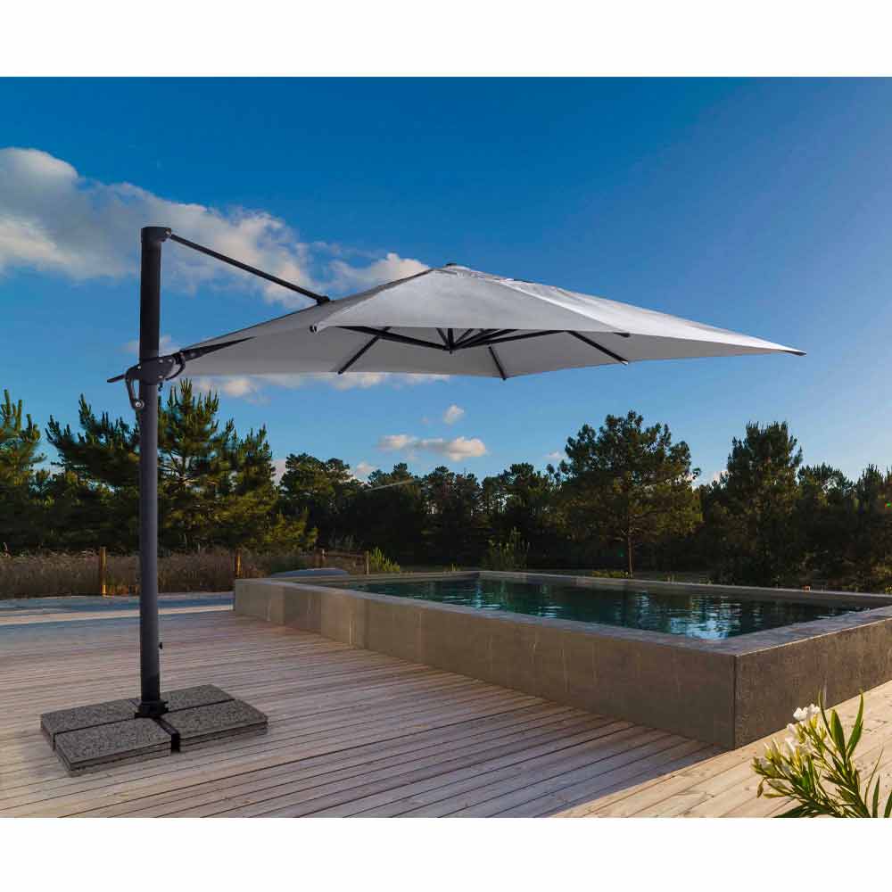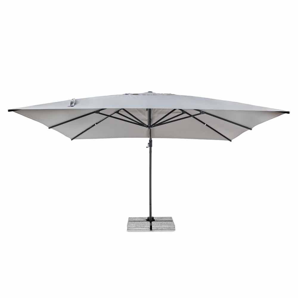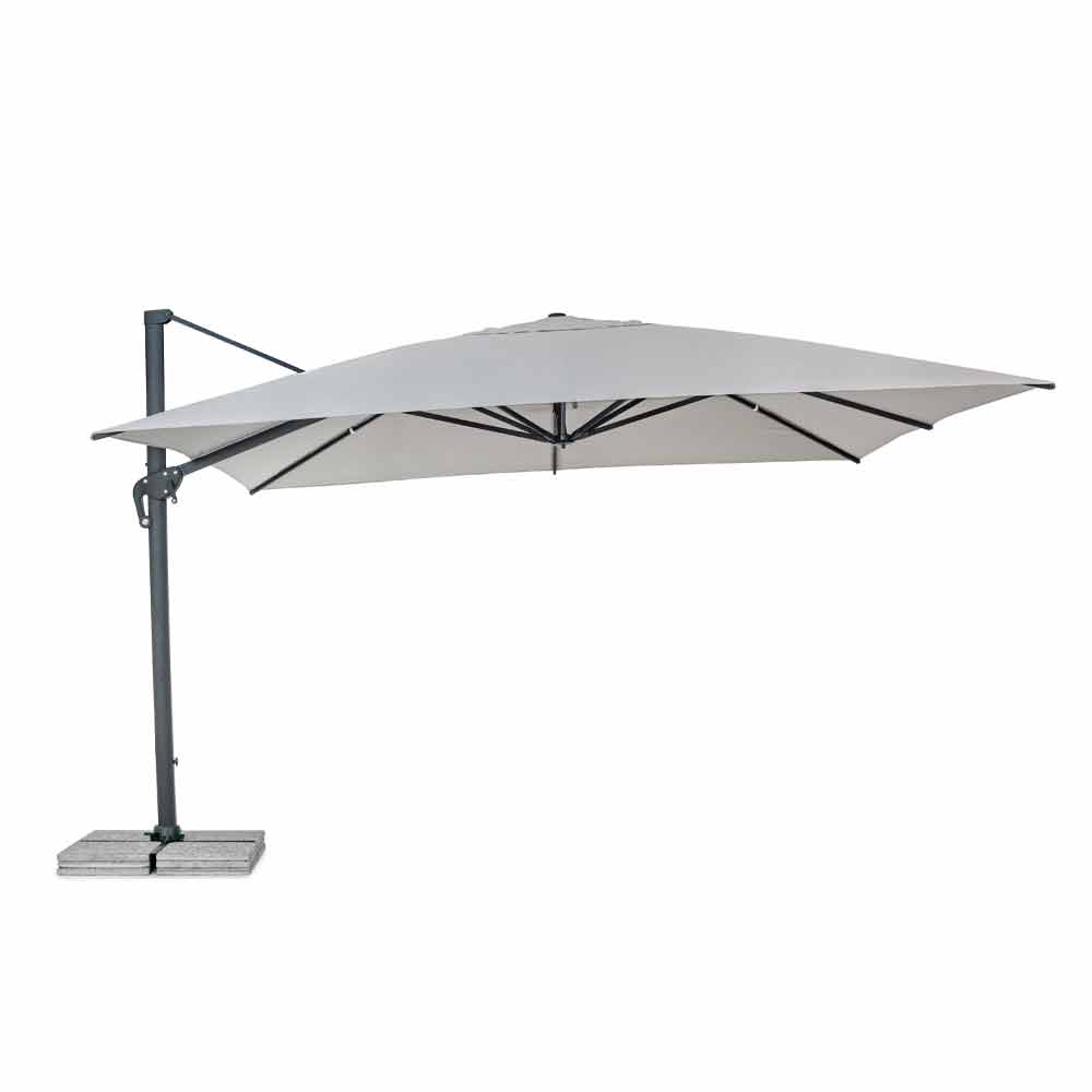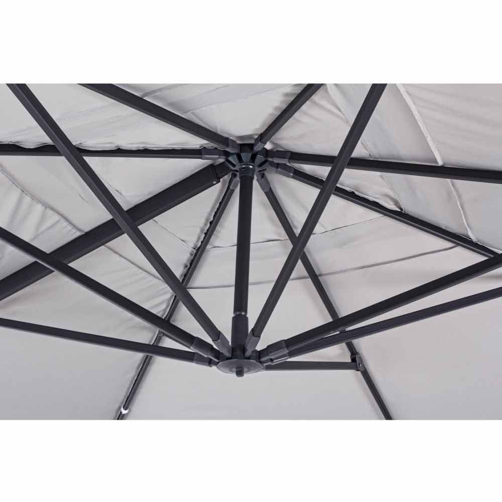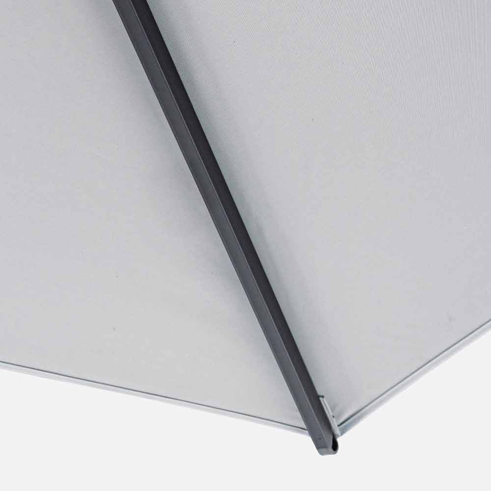 Konstrukcja aluminiowa malowana proszkowo (poliester). Tyczka 93x57mm. 8 żeber 28x18mm. Jasnoszara tkanina poliestrowa 250 g / m2 z powłoką pa (poliamid). Podstawa krzyżowa ze stali . Tyczka obrotowa 360 ° z pedałem. Pochylenie w pionie z 5-pozycyjną rączką. W zestawie pokrowiec na parasol.