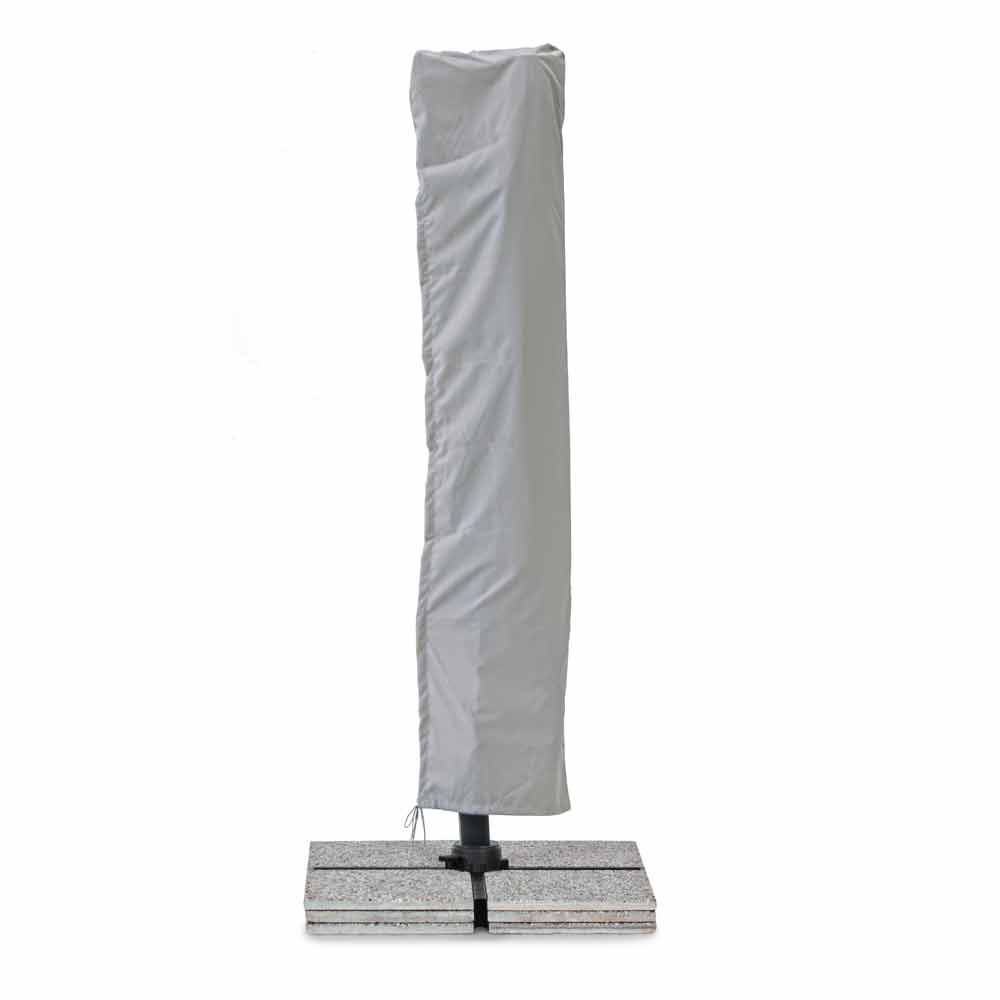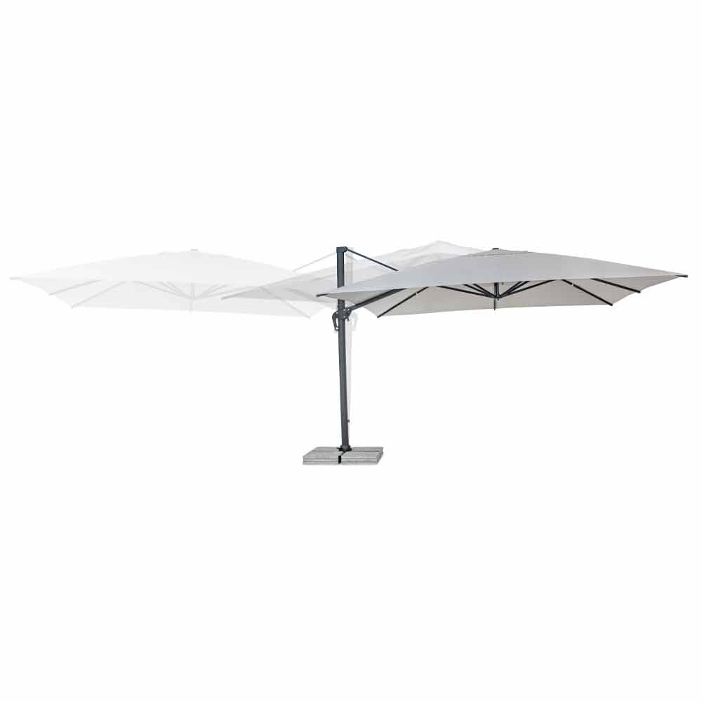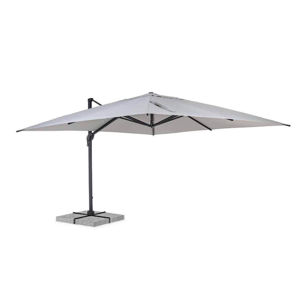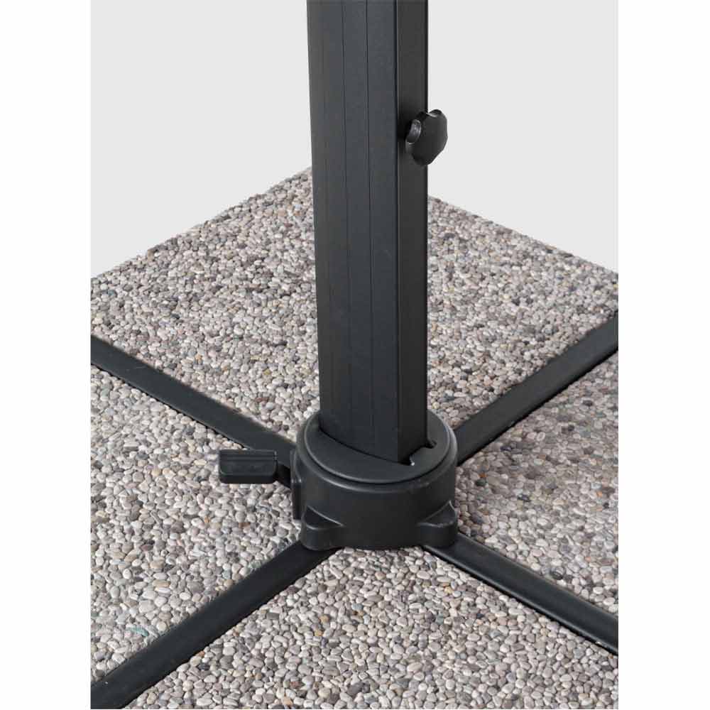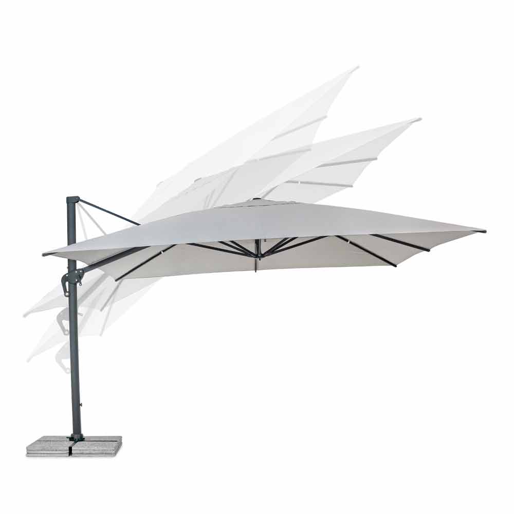 Konstrukcja aluminiowa malowana proszkowo (poliester). Tyczka 93x57mm. 8 żeber 28x18mm. Jasnoszara tkanina poliestrowa 250 g / m2 z powłoką pa (poliamid). Podstawa krzyżowa ze stali . Tyczka obrotowa 360 ° z pedałem. Pochylenie w pionie z 5-pozycyjną rączką. W zestawie pokrowiec na parasol.