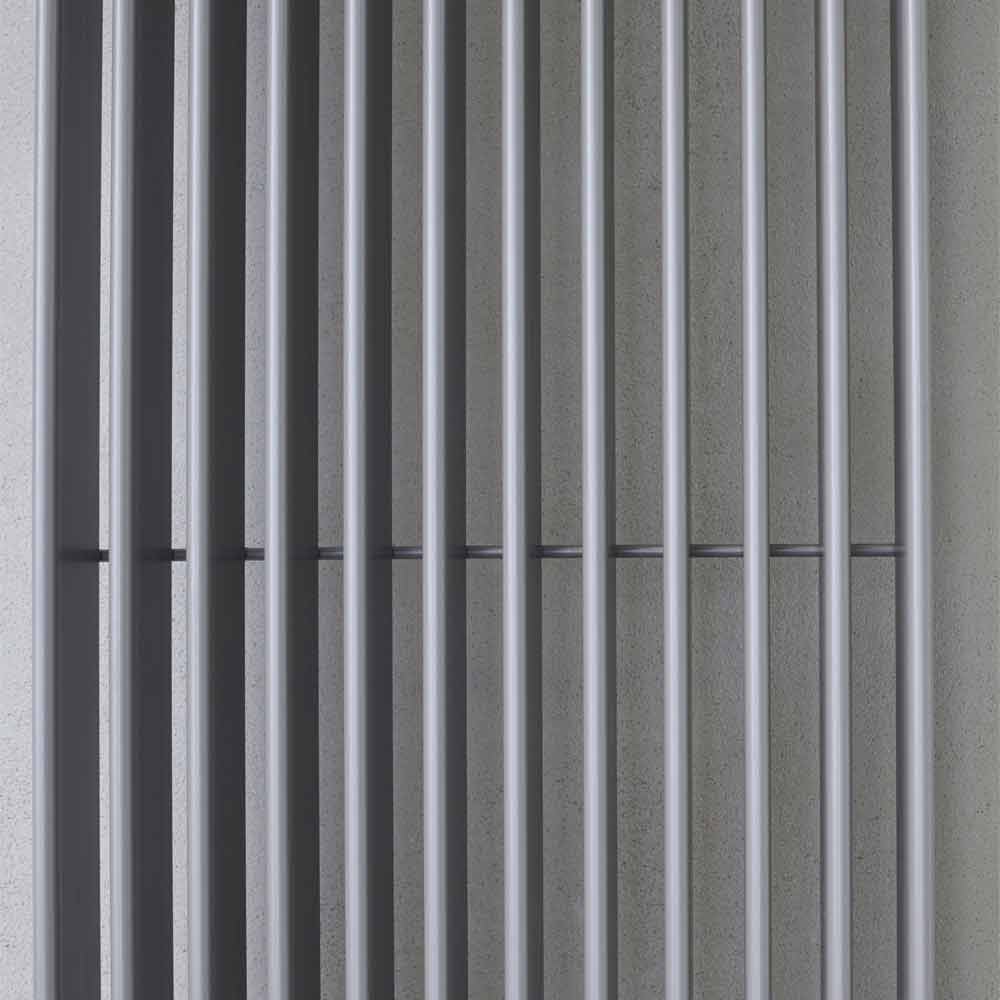 z pionowych płaskich rur 70 x 11 mm przyspawanych prostopadle do kolektorów o średnicy 35 mm, co zapewnia minimalistyczny i nowoczesny wygląd.