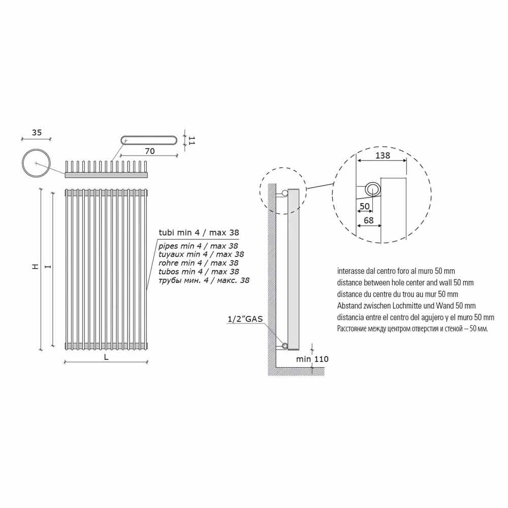 Pionowy grzejnik rurowy ze stali, nowoczesny design ścienny, wyprodukowany we Włoszech.