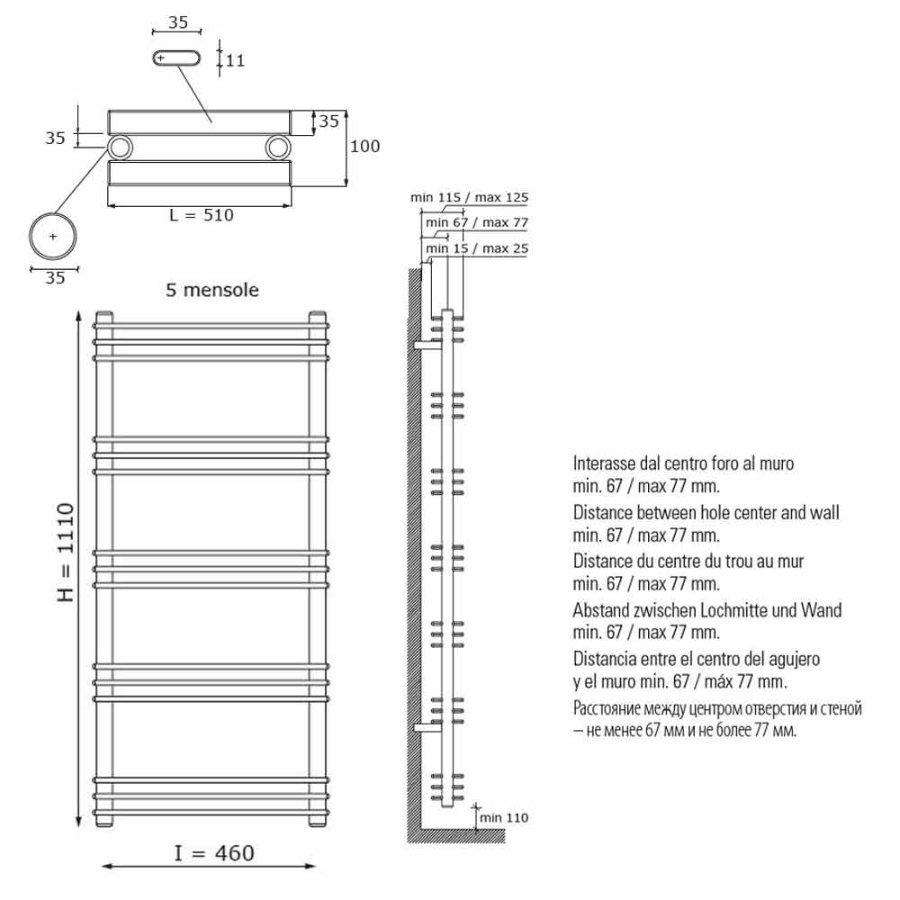 Wymiary *:- Wys. 1110 x dł. 510 x szer. 35 x wew. 460 mm x moc wyjściowa w (Δt50 *) 530; Wydajność w (Δt30 *) 290; Wydajność w (Δt26 *) 240.