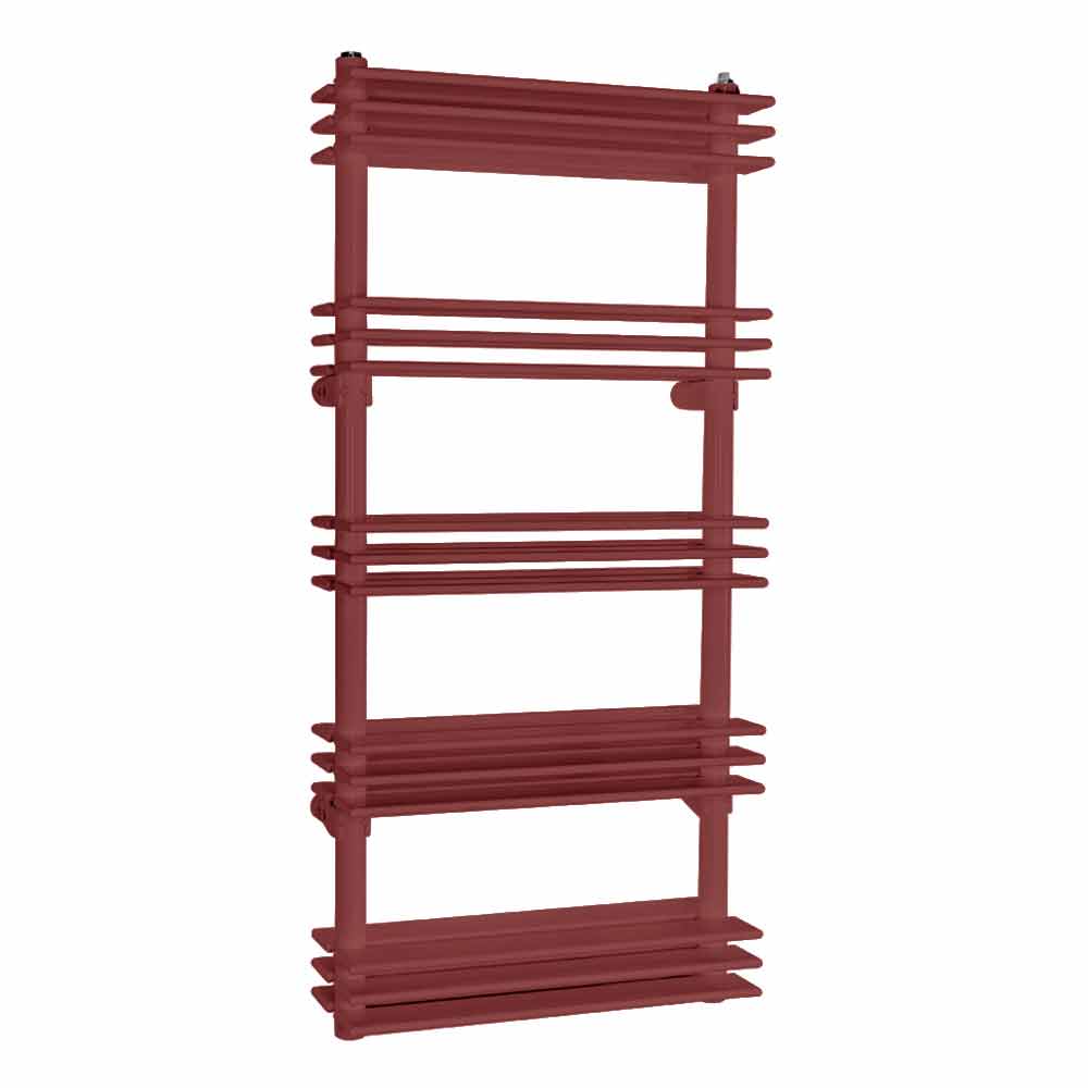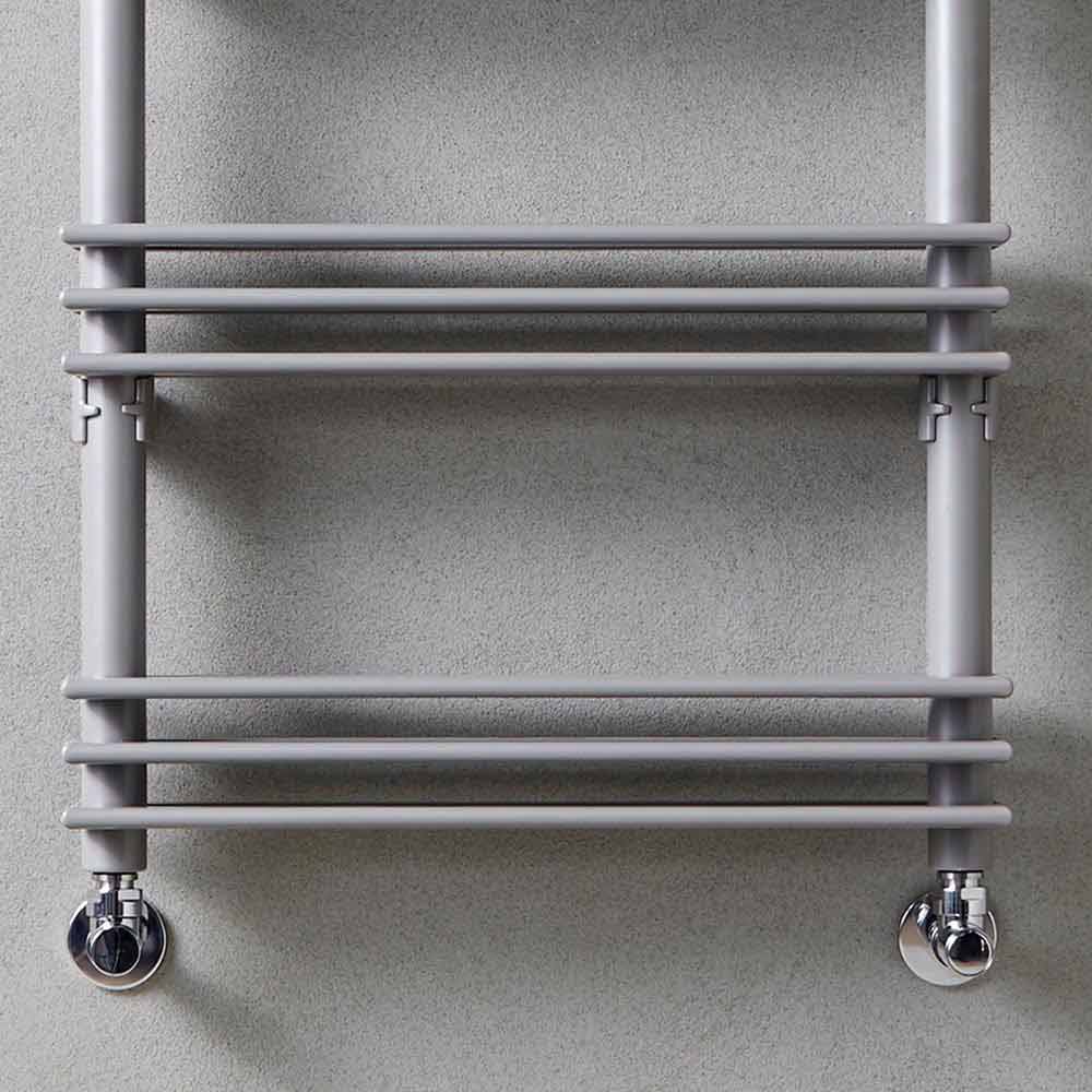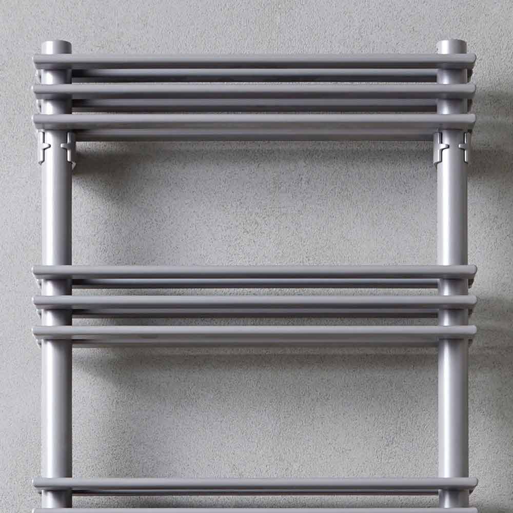 grzejnik hydrauliczny ma wielofunkcyjną konstrukcję składającą się z pionowych rur i poziomych płyt, które mogą pełnić funkcję prawdziwych półek.