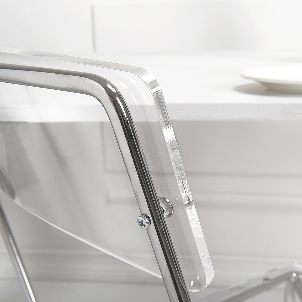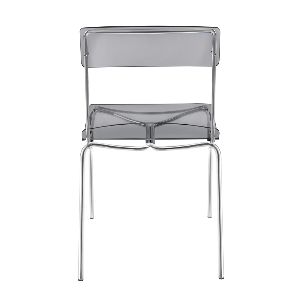 Krzesło do jadalni ze skorupą z pleksiglasu i metalową konstrukcją chromowaną na srebrno , w całości wyprodukowane we Włoszech . Idealne rozwiązanie meblowe dla osób poszukujących prostoty i wszechstronności użytkowania , aby móc urządzić domowe przestrzenie o nowoczesnym charakterze i wysokiej funkcjonalności . Kształt konstrukcji umożliwia również układanie ich w stosy, dzięki czemu doskonale sprawdza się również w przestrzeniach kontraktowych, takich jak bary i restauracje.