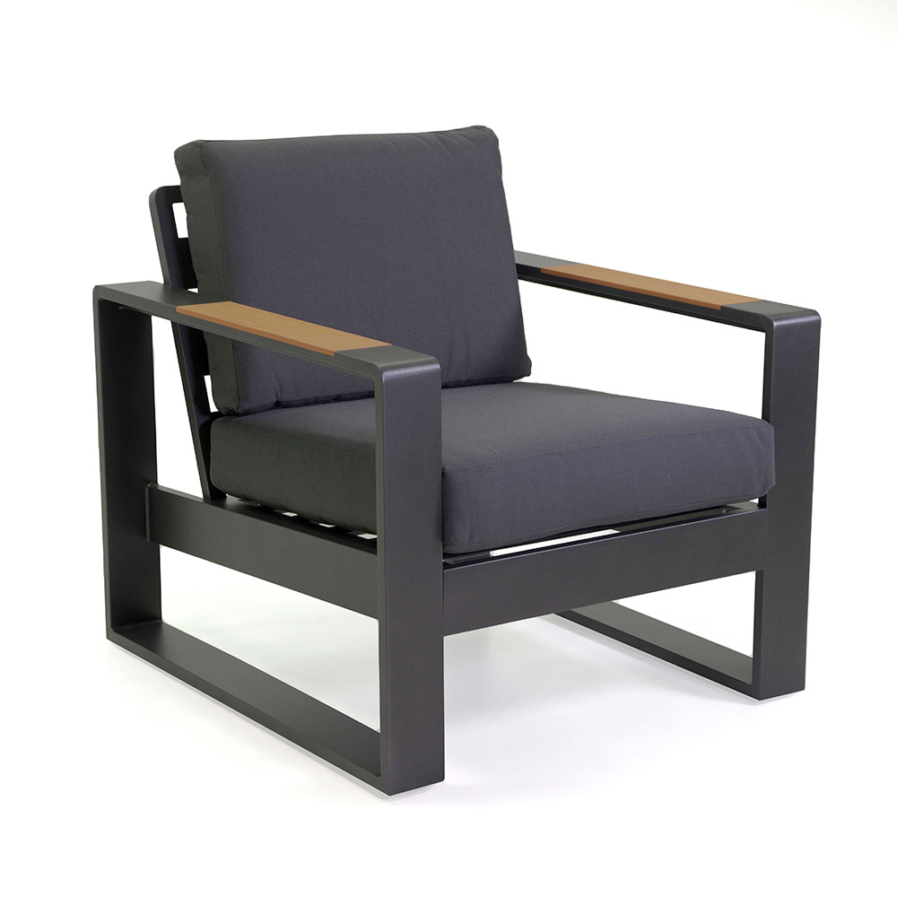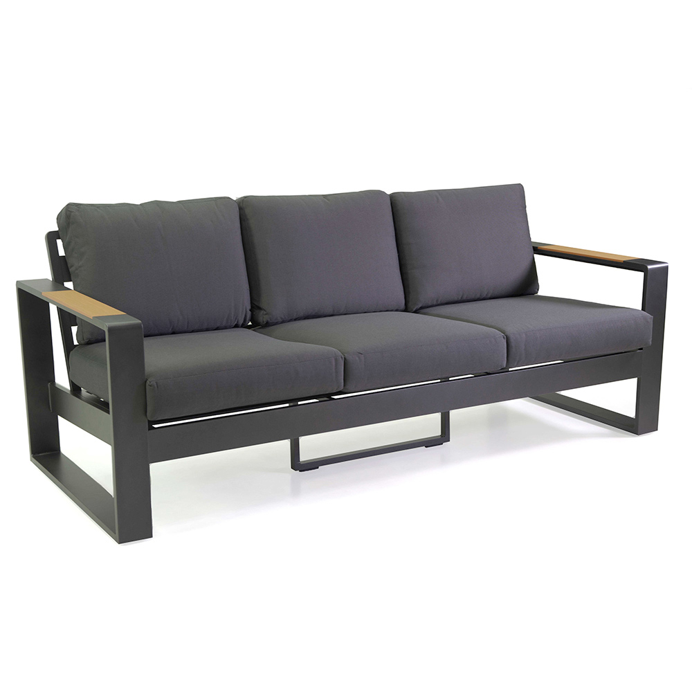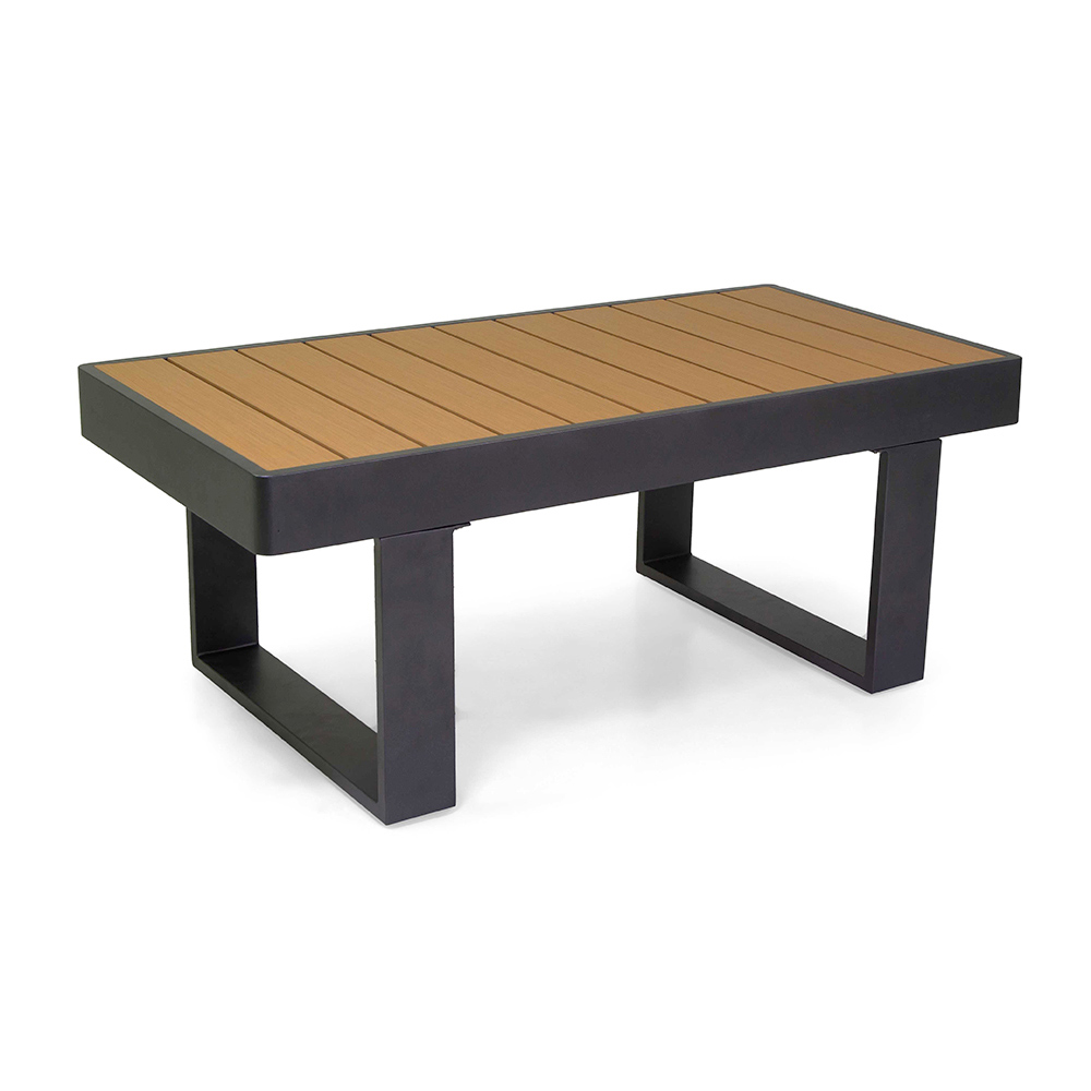 Drewniane podłokietniki dodają odrobinę naturalnego ciepła, które pięknie kontrastuje z ramą, tworząc zachęcającą atmosferę do relaksu lub rozrywki. Dopasowany stolik kawowy jest idealny do przechowywania napojów i przekąsek pod ręką, dzięki czemu zestaw ten jest doskonałym wyborem na każde patio lub do ogrodu.
