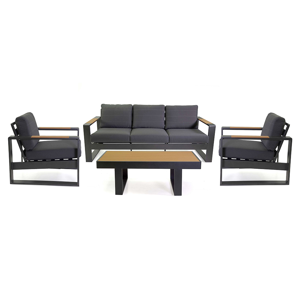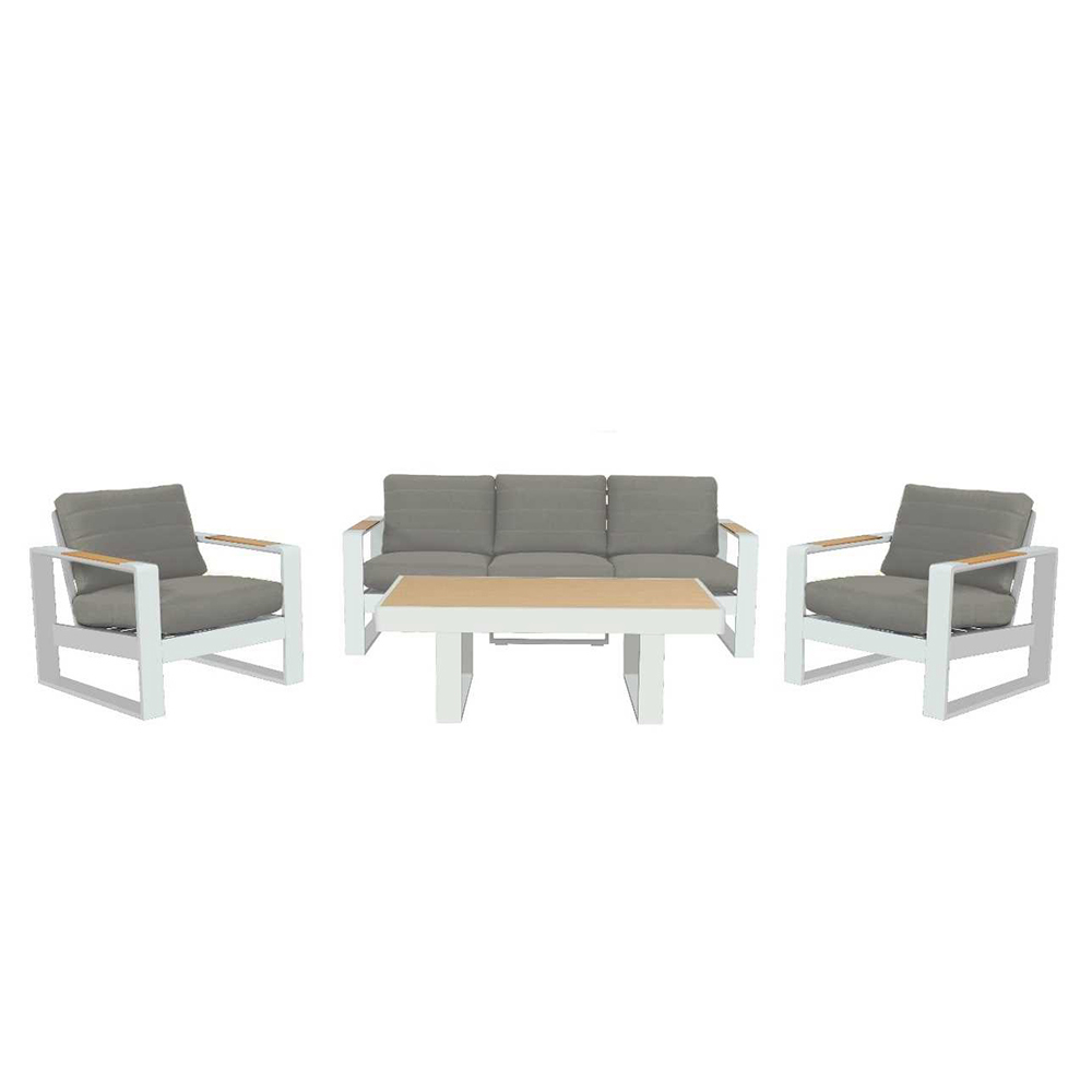Ten elegancki zestaw wypoczynkowy to idealne połączenie stylu i komfortu. Charakteryzuje się czystymi liniami i nowoczesnym wzornictwem, oferując wyrafinowane i przyjazne rozwiązanie dla każdej przestrzeni zewnętrznej. Połączenie odpornego na korozję aluminium i miękkich poduszek z wysokiej jakości tkaniny zapewnia trwałość i łatwą konserwację, dzięki czemu idealnie nadaje się do codziennego użytku.