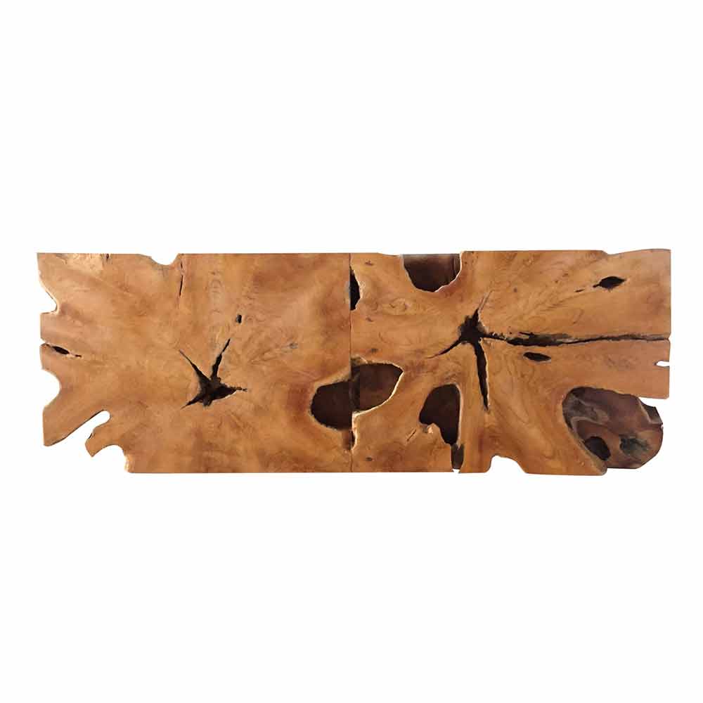 litego drewna tekowego odzyskanego i połączonego ze sobą. Prostokątny kształt wierzchołka zachowuje jednak wszystkie cechy użytego pnia lub korzenia. Sęki drewna i szczepy gałęzi, nieregularności pnia i odcienie koloru, rysują na każdym blacie